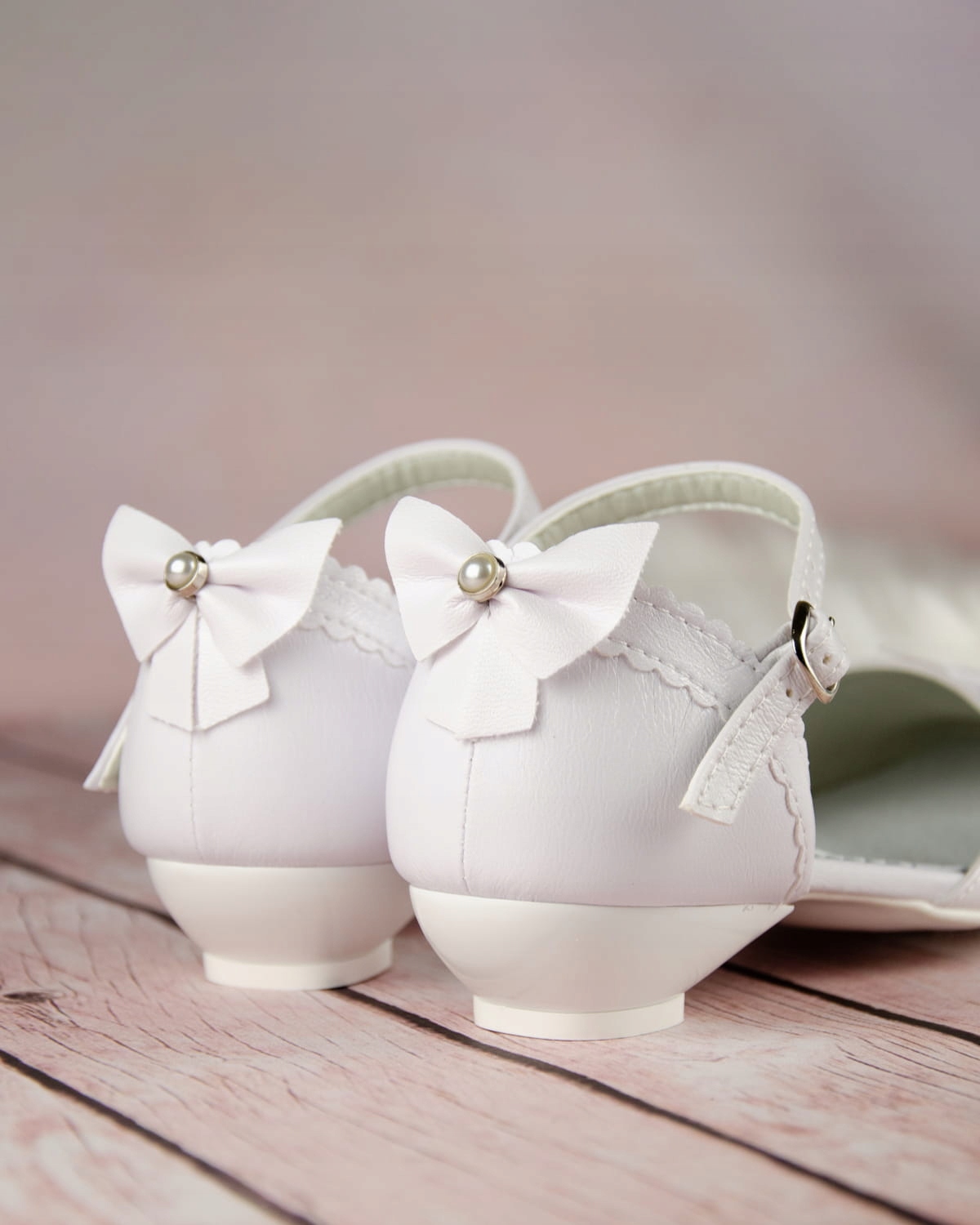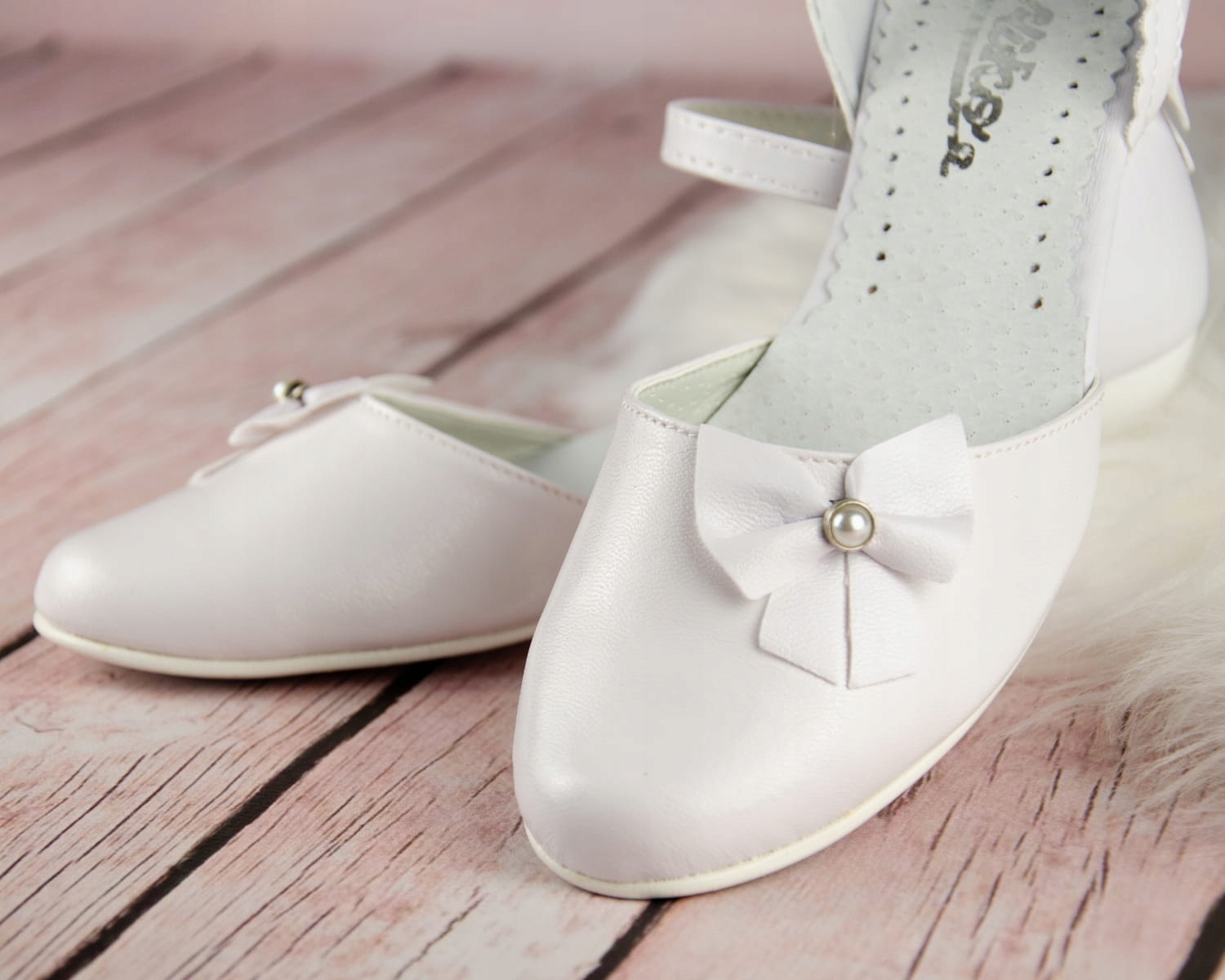 Елегантні білі туфлі для причастя для дівчинки. Дизайн із застібкою та регульованим ремінцем. Взуття має гарну форму, що робить його дуже зручним. Модель на ніжному каблуці висотою 2,5 см білого кольору. Його чарівність підсилюють бантики, прикрашені перлами, які розташовані на передній частині верху і додатково на п'яті. Дуже дівчача модель, яка пасуватиме до більшості суконь та альбомів. Зовнішня частина взуття виготовлена з екологічної шкіри, а каблук і устілка - з натуральної шкіри.