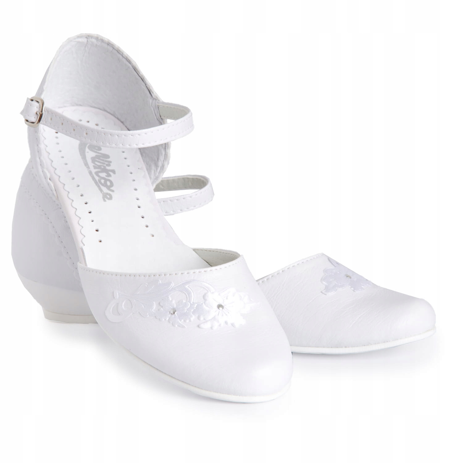 Елегантні білі туфлі для причастя для дівчинки. Дизайн із застібкою та регульованим ремінцем. Взуття має гарну форму, що робить його дуже зручним. Модель на ніжному каблуці висотою 2,5 см білого кольору. Біла квітка додає їм чарівності. Класична модель, яка пасуватиме до більшості суконь чи альбомів. Зовнішня частина взуття виконана з екологічної шкіри, а каблук і устілка - з натуральної шкіри.