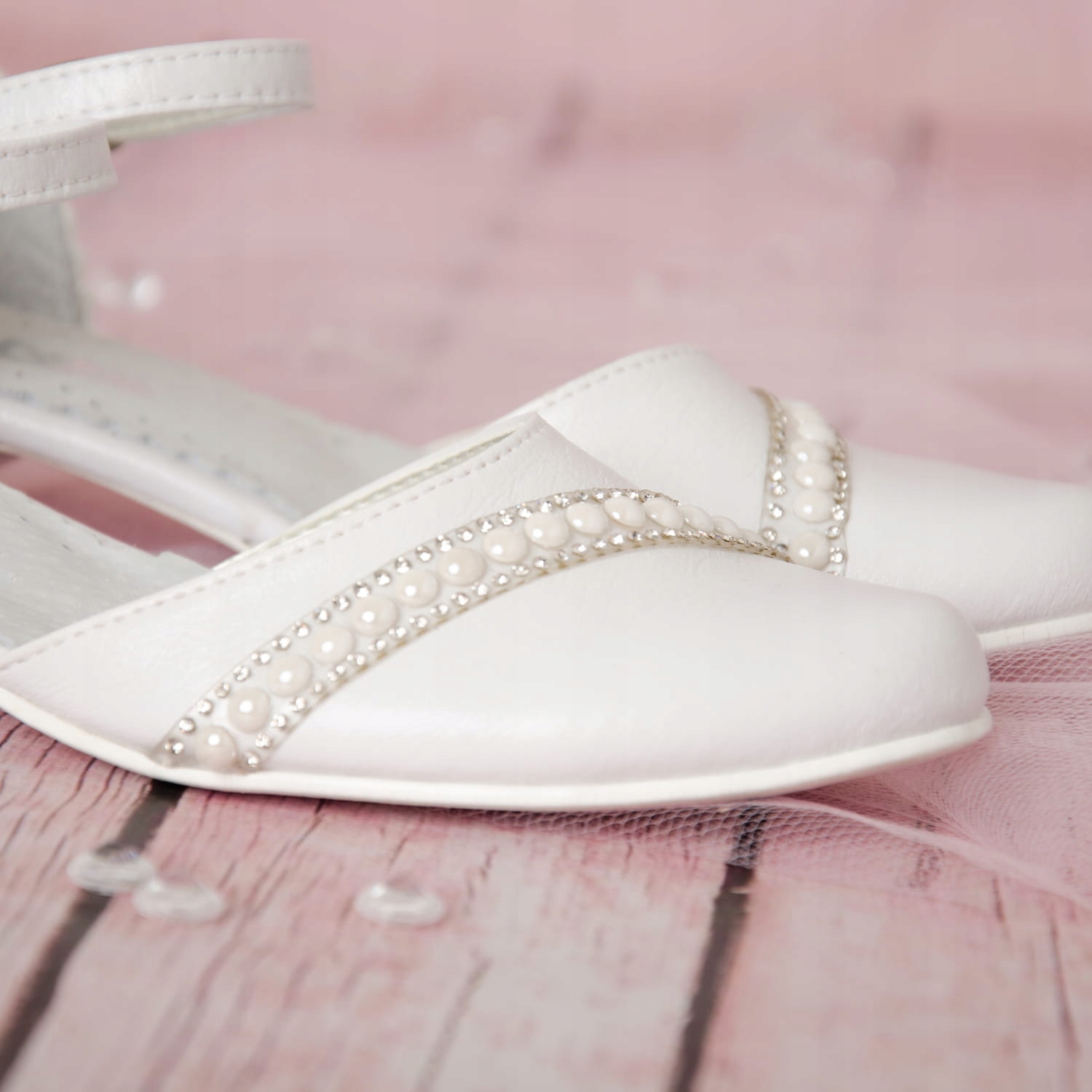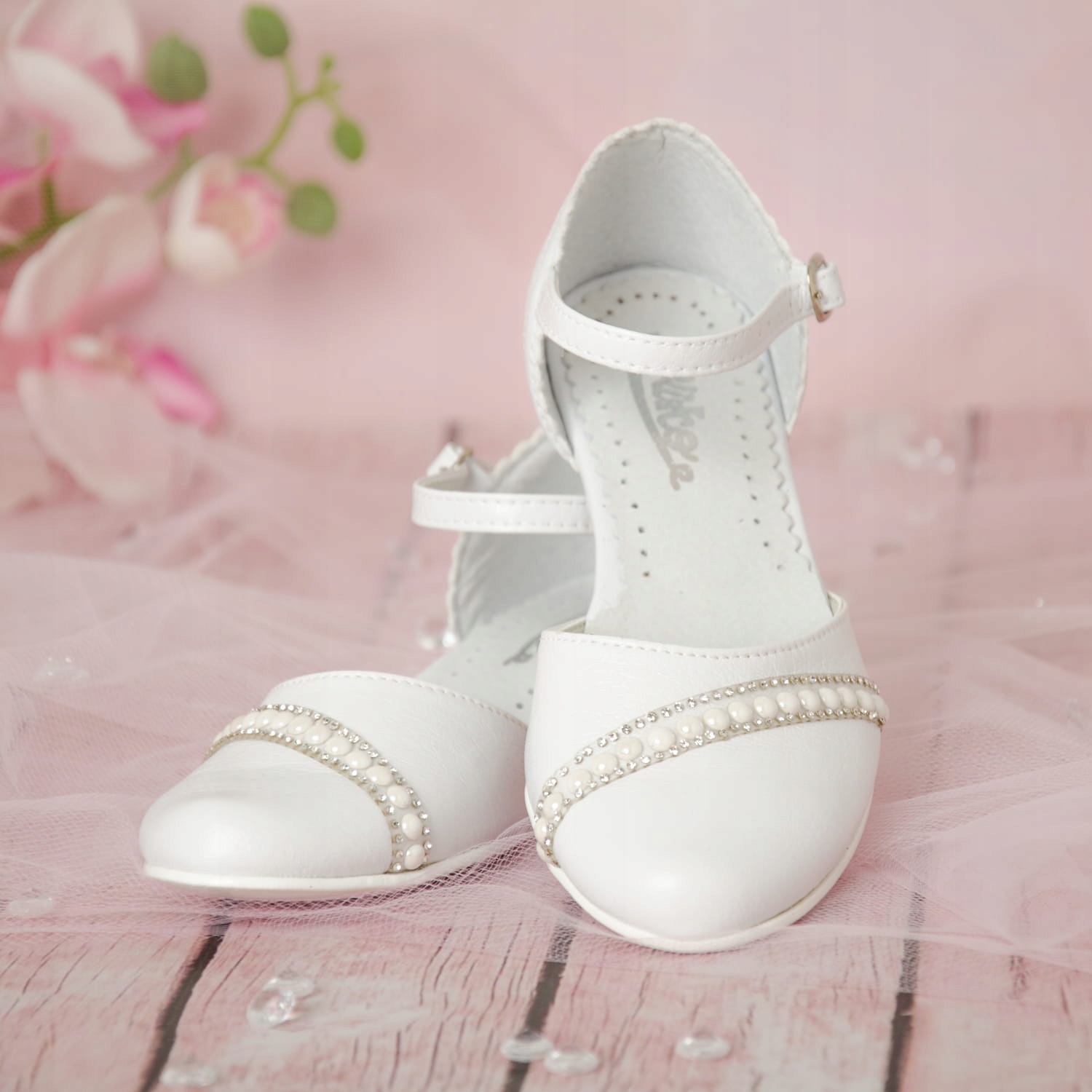 Елегантні білі туфлі для причастя для дівчинки. Дизайн із застібкою та регульованим ремінцем. Взуття має гарну форму, що робить його дуже зручним. Модель на ніжному каблуці висотою 2,5 см білого кольору. Перли додають їм шарму. Класична модель, яка пасуватиме до більшості суконь чи альбомів. Зовнішня частина взуття виконана з екологічної шкіри, а каблук і устілка - з натуральної шкіри.