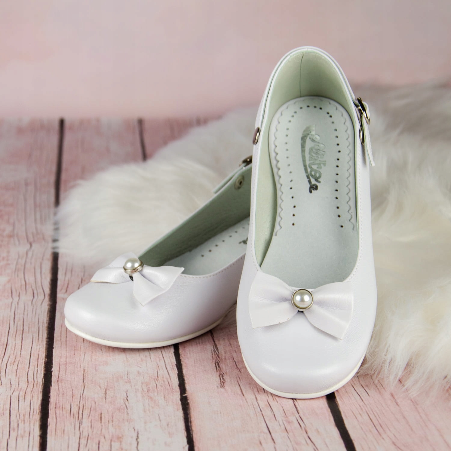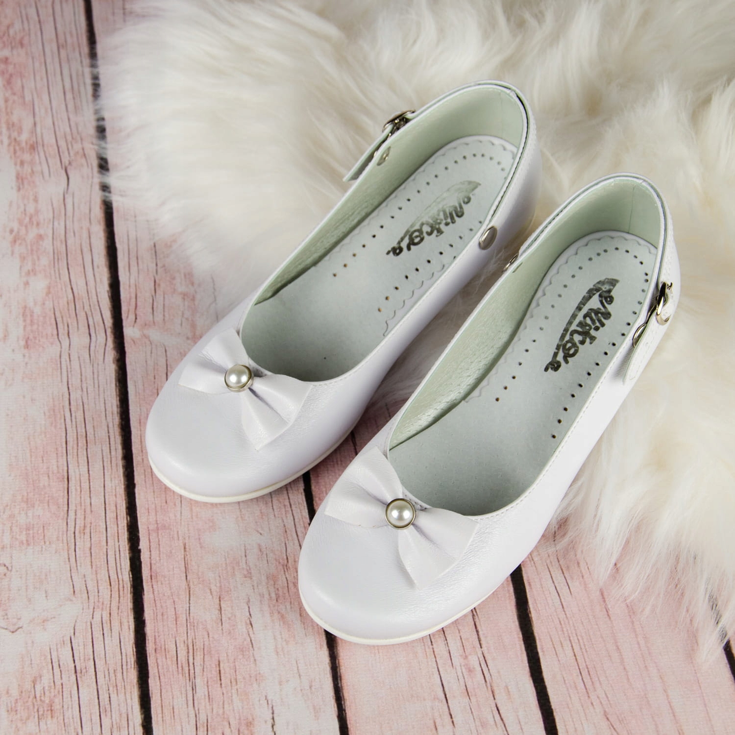 Елегантні білі туфлі для причастя для дівчат. Взуття має гарну форму, тому надійно облягає ногу. Крім того, вони мають ремінець, який можна використовувати спереду для кращої підтримки стопи або ззаду як прикрасу. Модель має ніжний каблук висотою 1,5 см, сріблястого кольору. Красивий бантик з перлиною посередині додає їм шарму. Зовнішня частина взуття виконана з екологічної шкіри, а устілка - з натуральної шкіри. Класичні балетки ідеально підходять для Першого Святого Причастя, інших урочистостей тощо.