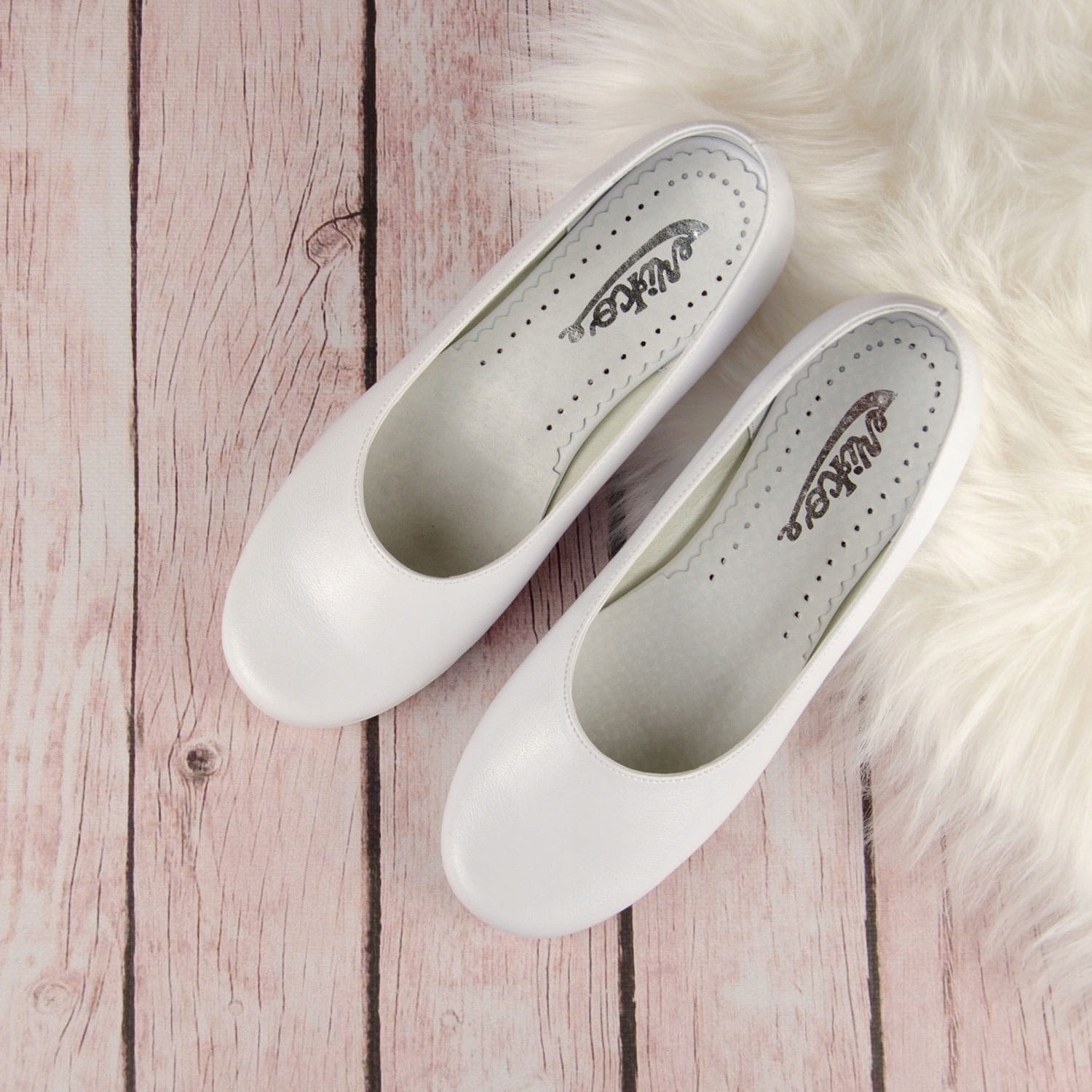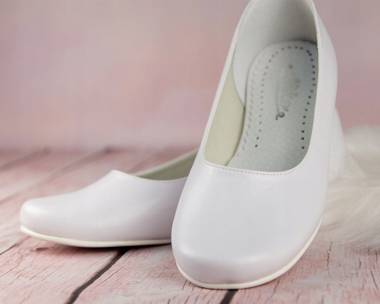 Елегантні білі туфлі для причастя для дівчат. Взуття має гарну форму, тому надійно облягає ногу. Модель має ніжний каблук висотою 1,5 см, сріблястого кольору. Гладка, універсальна модель, яка підійде під будь-яке плаття чи альбу. Зовнішня частина взуття виготовлена з екологічної шкіри, а устілка - з натуральної шкіри. Класичні балетки ідеально підходять для Першого Святого Причастя, інших урочистостей тощо.