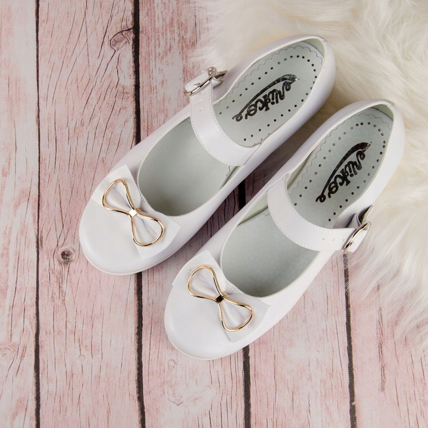 Елегантні білі туфлі для причастя для дівчинки. Взуття має гарну форму, що робить його дуже зручним. Крім того, вони мають ремінь спереду для кращої підтримки стопи. Модель має ніжний каблук висотою 1,5 см, золотого кольору. Красивий бантик із золотим декором додає їм шарму. Зовнішня частина взуття виготовлена з екологічної шкіри, а устілка - з натуральної шкіри. Класичні балетки ідеально підходять для Першого Святого Причастя, інших урочистостей тощо.
