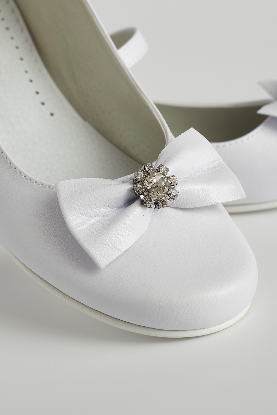 Зручне взуття для причастя з м'якою шкіряною устілкою, збоку застібка на пряжку. Підошва стійка до стирання, нога у взутті тримається в правильному положенні. Легке та зручне взуття для причастя. Прикрашена елегантним бантом з цирконами. Розміри 30-39