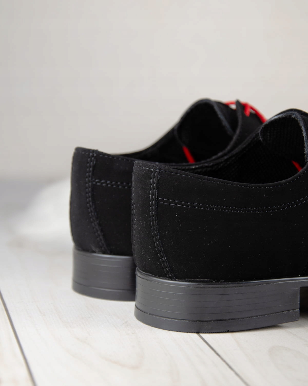 Класичні чорні туфлі для причастя для хлопчика. Взуття має гарну форму, що робить його дуже зручним. Елегантна модель з червоними шнурками, які додають шарму. У комплект також входять чорні шнурки. Зовні взуття виготовлено з м'якого екологічного нубуку, а устілка - з натуральної шкіри.