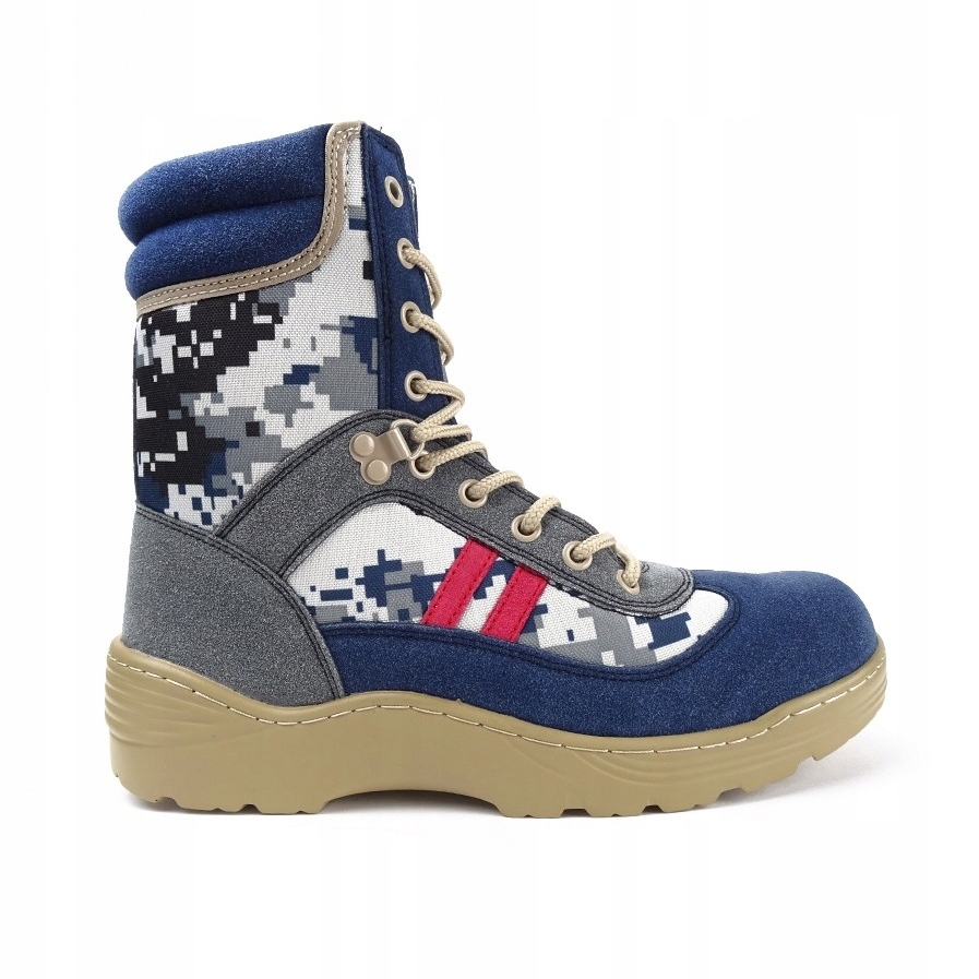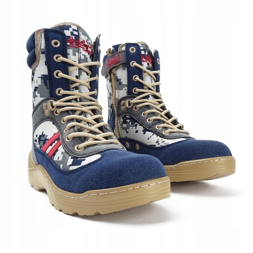 Стильне взуття з вишитим логотипом із колекції #CrazyArmyColor. Логотип червоний, а корпус взуття синьо-сірий у поєднанні з цифровою версією сіро-блакитного камуфляжу. Підошва пісочного кольору. Застібка-блискавка, закріплена липучкою. Взуття виготовлене з легких, водопроникних матеріалів і має пом'якшену поліуретанову підошву, яка є гнучкою та забезпечує високий комфорт під час водіння.
