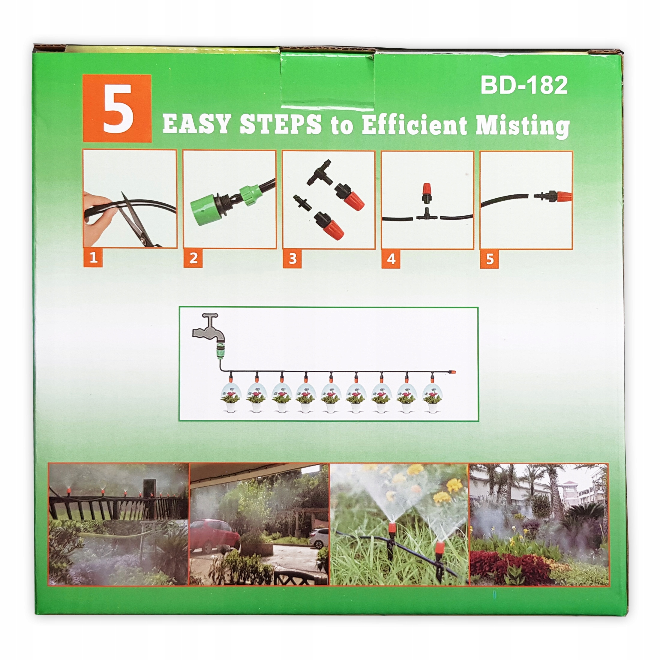 4 > Просто підключіть шланг у джерело води водопостачання, а система охолодження туману автоматично розпорошить і охолоне місце. Установка -це енергетична та екологічна, вона не використовує електроенергію, економить ваші гроші. У шлангу вже встановлено форсунки для виробництва туману. Вам не потрібно вирізати, ви купуєте набір, готовий до складання.