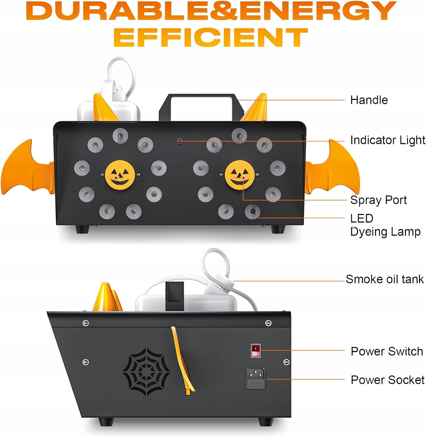 Широкий спектр застосування - пристрій має розміри 34 х 34 х 26 см, важить близько 4,2 кг і постачається з бездротовим пультом дистанційного керування. На Хеллоуїн, Різдво, в театрах, концертах, торгові центри, на вечірках, в будинках з привидами, на весіллях, під час живих вечірок та сімейних зборів, ця машина до туману вводить настрій та мобілізує емоції нинішніх людей. Ефект вишуканого світла: 18 світлодіодів забезпечує досить яскраве світло для випарника. Він підходить для прикраси на Хеллоуїн, приємне світло для вечірки та густий дим створюють унікальну атмосферу, дуже мрійливу та романтичну. Відмінна ефективність - початковий час нагрівання 3-5 хвилин та інтервал нагрівання приблизно на 1 хвилину Хеллоуїнську туманну машину забезпечує безперервний потік туману приблизно на 1 хвилину, з відстані розпилення до 5 метрів, наповнює кімнату за мить. 1,5 -літер для туману забезпечує велику ємність, завдяки якій події можна продовжувати. Унікальний дизайн - туманна машина, яка відповідає темі Хеллоуїна. Гарбузові елементи та маленькі крила роблять його живим. Так з туманною рідиною видаляється і розміщується поруч із генератором туману. Генератор туману може стояти вертикально і стріляти дим на вечірці.