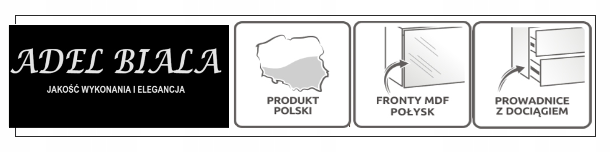 Меблі з колекції Adel Biała виготовлені з високоякісних матеріалів. Для створення фасадів використовувалися, серед іншого: Плити МДФ товщиною 16 мм. Вони виконані в білому глянці, завдяки чому вони поєднуються з меблями багатьох кімнат і ефективно відбивають світло.