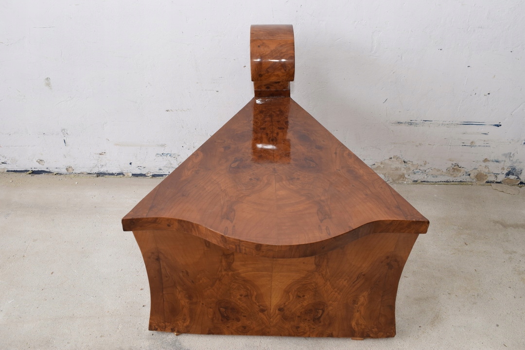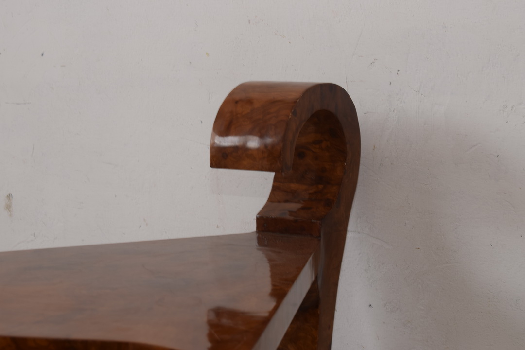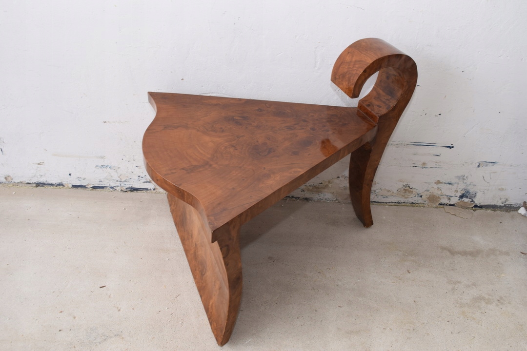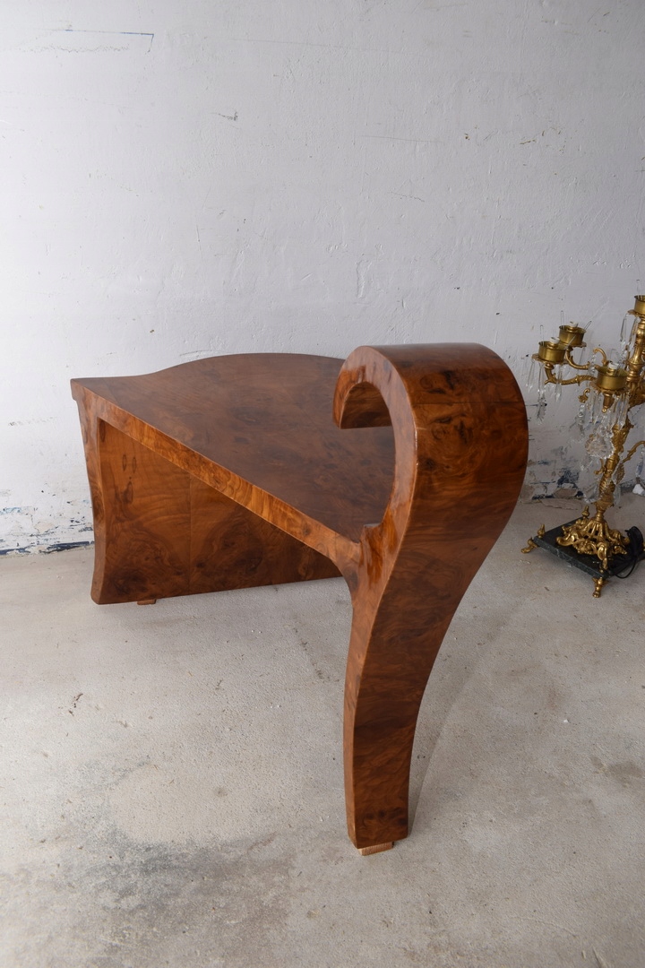 Запрошуємо вас ознайомитися з нашою елегантною тумбочкою в стилі ар-деко, яку також можна використовувати як елегантний журнальний столик. Виготовлений із гнутої деревини, цей стіл характеризується унікальним дизайном і незвичайною формою.