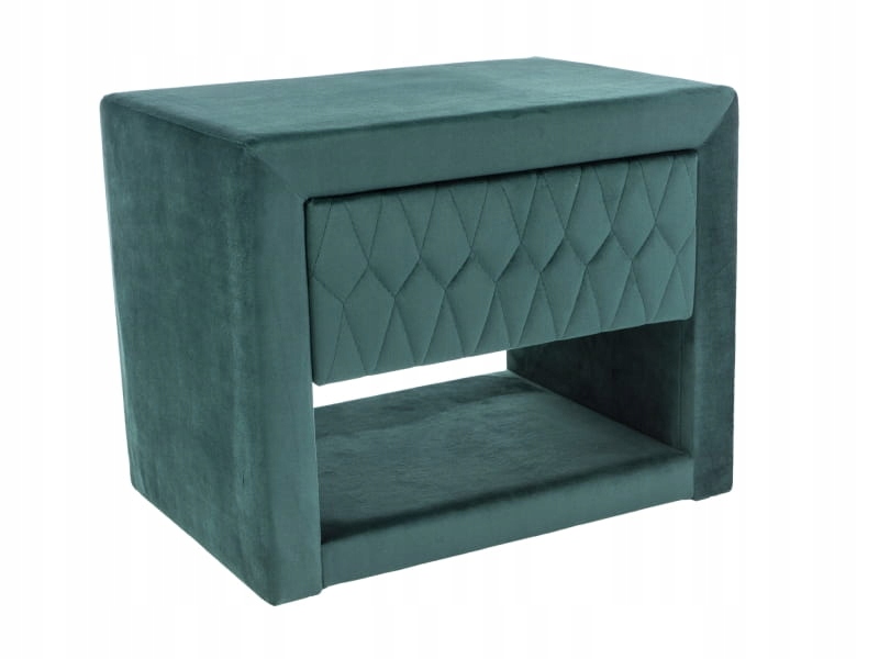 Ніжкова тумба AZURRO від Signal доповнить декор будь-якої гламурної спальні. Тумба має практичний ящик для дрібниць, передня частина якого прикрашена цікавою строчкою, що додає шарму всьому предмету меблів. Він повністю оббитий приємним на дотик оксамитом модного в цьому сезоні кольору пляшкового зеленого. Тумбочка Azurro разом з однойменним ліжком і комодом утворюють ідеальне ціле.