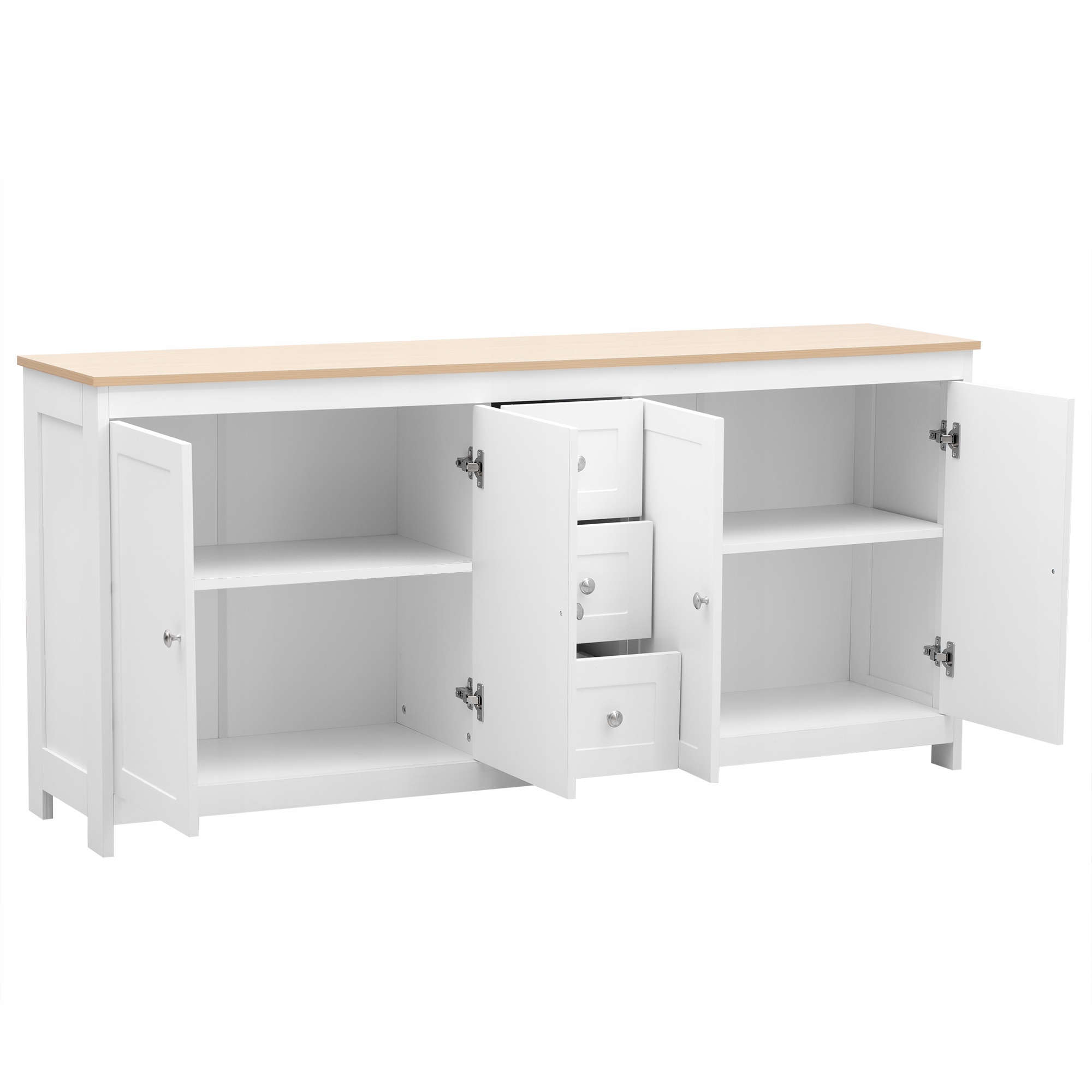 Цей комод — це елегантний, природний і компактний допоміжний засіб для зберігання в стилі природного фермерського будинку для вашої їдальні, спальні чи вітальні. Шикарне поєднання білого з контрастним деревним відтінком перетворить будь-який житловий простір із традиційного інтер’єру на сучасний. Завдяки чотирьом дверцятам і трьом висувним ящикам під цією конструкцією ви зможете легко зберігати корисні речі і зробити свій дім більш охайним і гідним.