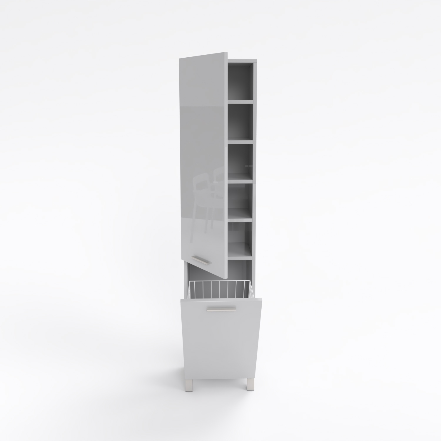 Шафа, стійка з кошиком для брудної білизни. Верхня частина оснащена регульованими полицями. Шафа виготовлена з високоякісної МДФ плити з УФ-лаком і ламінованої плити. Краї обклеєні ПВХ кантом. Висока якість глянцю понад 100 голосів. Глянцеві елементи покриті захисною плівкою. Меблі готові до самостійної збірки, яка є простою та інтуїтивно зрозумілою, в її основі лежить система дюбелів та ексцентриків, які не потрібно склеювати, виріб можна розібрати та зібрати в будь-який час, в упаковці є інструкція з експлуатації на 3 мовах. Боковини шафи однорідні без отворів зовні, що підвищує естетичність виробу. Шафа підвісна . Ми не використовуємо кришки всередині, щоб зменшити кількість пластику. Після упаковки шафи все одно технологічних дірок не видно. Упаковка по 2 упаковки