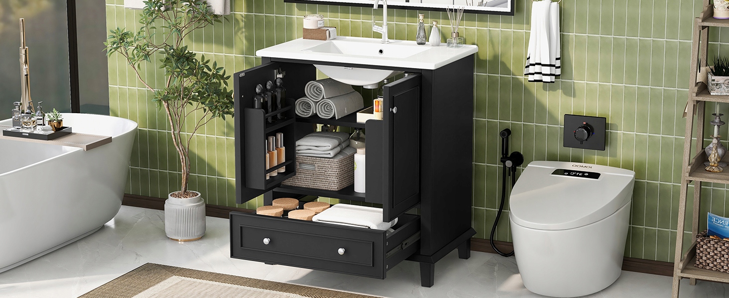 - Чорний корпус простий і елегантний, а тиснені візерунки на дверцятах і ящиках шаф у поєднанні з чорними ручками ще більше підкреслюють його унікальність і сучасний характер. Він ідеально доповнить ванні кімнати різних стилів, покращуючи естетику інтер’єру.