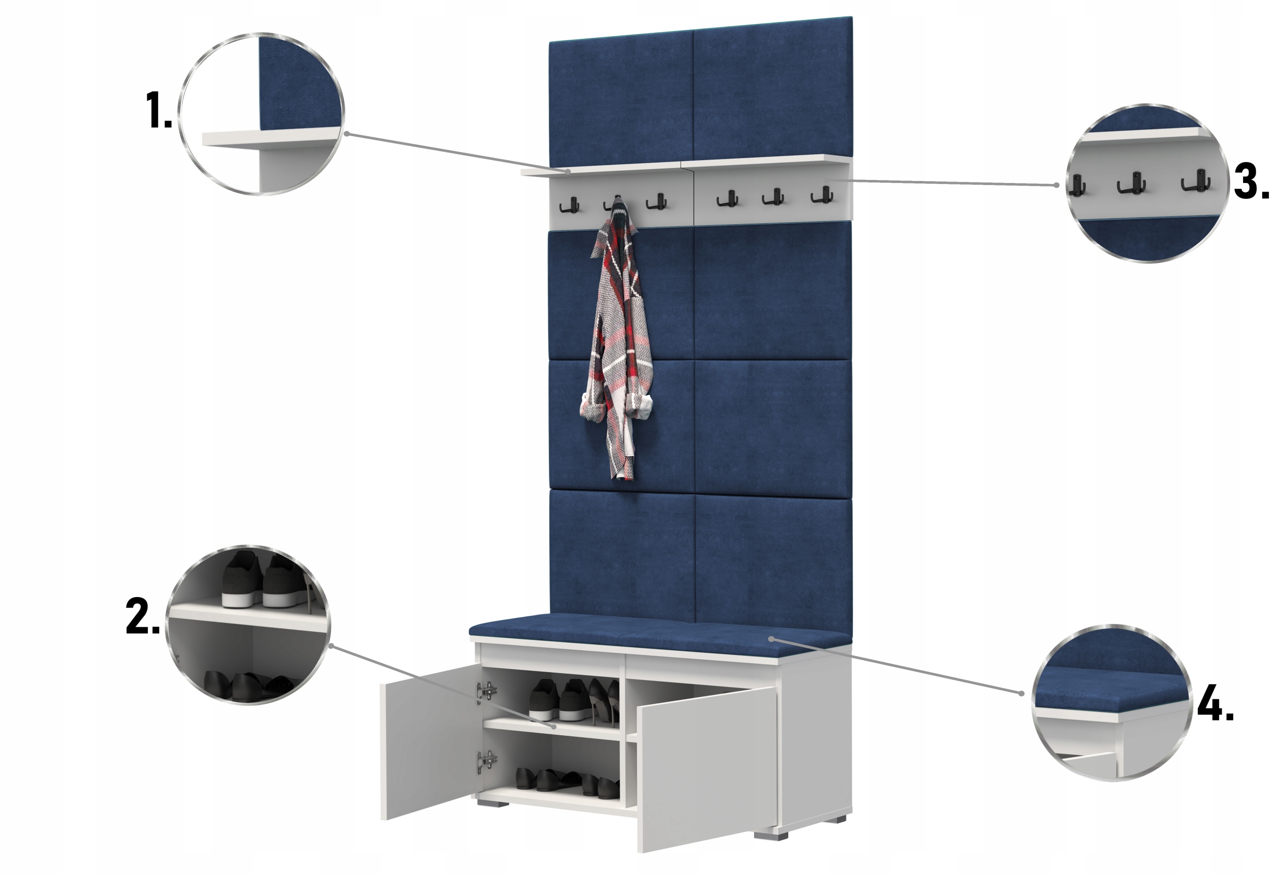 Сучасна шафа для взуття з сидінням, вішалкою та панелями Nevada 100 для передпокою, доступна в 3 кольорах: білий, Sonoma, крафт і з трьома кольорами панелей: сірим, темно-синім, пляшково-зеленим.