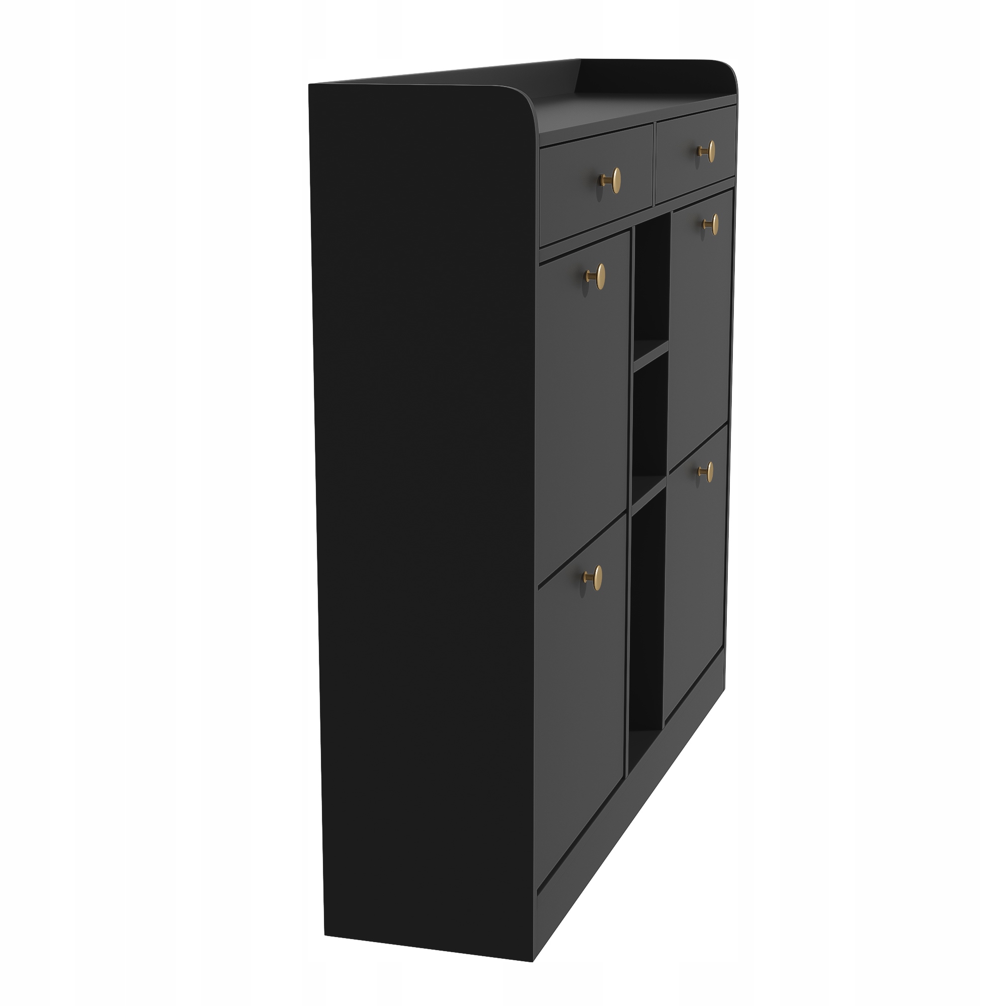 Елегантна чорна тумба для взуття з 4 дверцятами на петлях, 2 висувними ящиками та 3 відкритими відділеннями - ідеально підходить для сучасних коридорів і прихожих, розміри 110 x 26 x 100 см