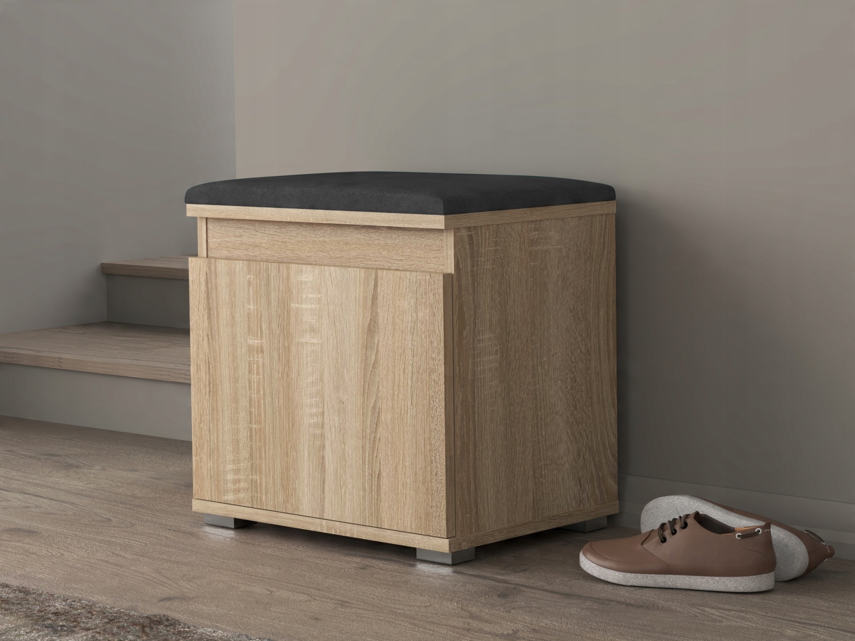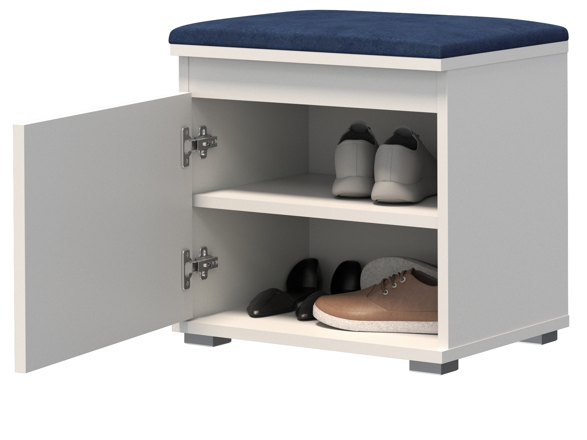 Сучасна тумба для взуття Nevada 50 для передпокою доступна в 3 кольорах: білий, сонома, крафт і з трьома кольорами панелей: сірий, темно-синій, пляшково-зелений.