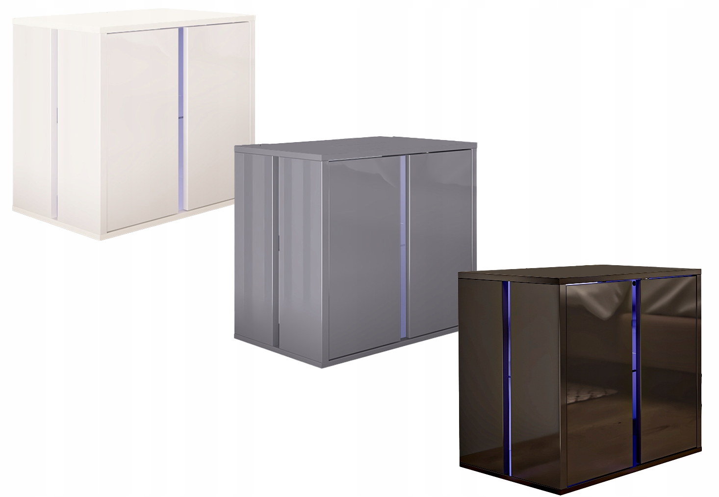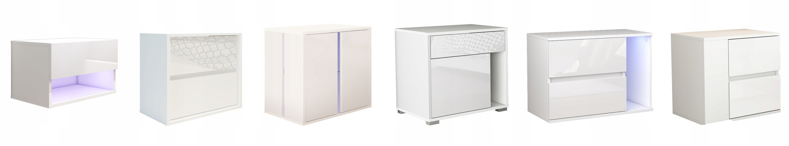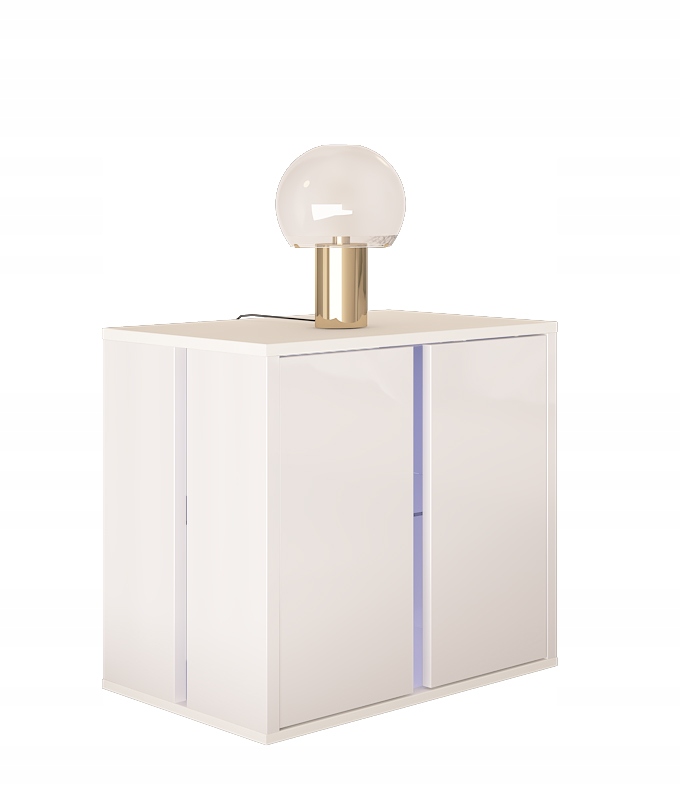 Ніжкова тумбочка — універсальна пропозиція для кожної спальні. Двері без ручок — це цікава комбінація з тонким світлодіодним освітленням RGB. Мінімалістичний стиль шафи підкреслює її дуже глянцева передня частина. Меблі доступні в трьох колірних конфігураціях: