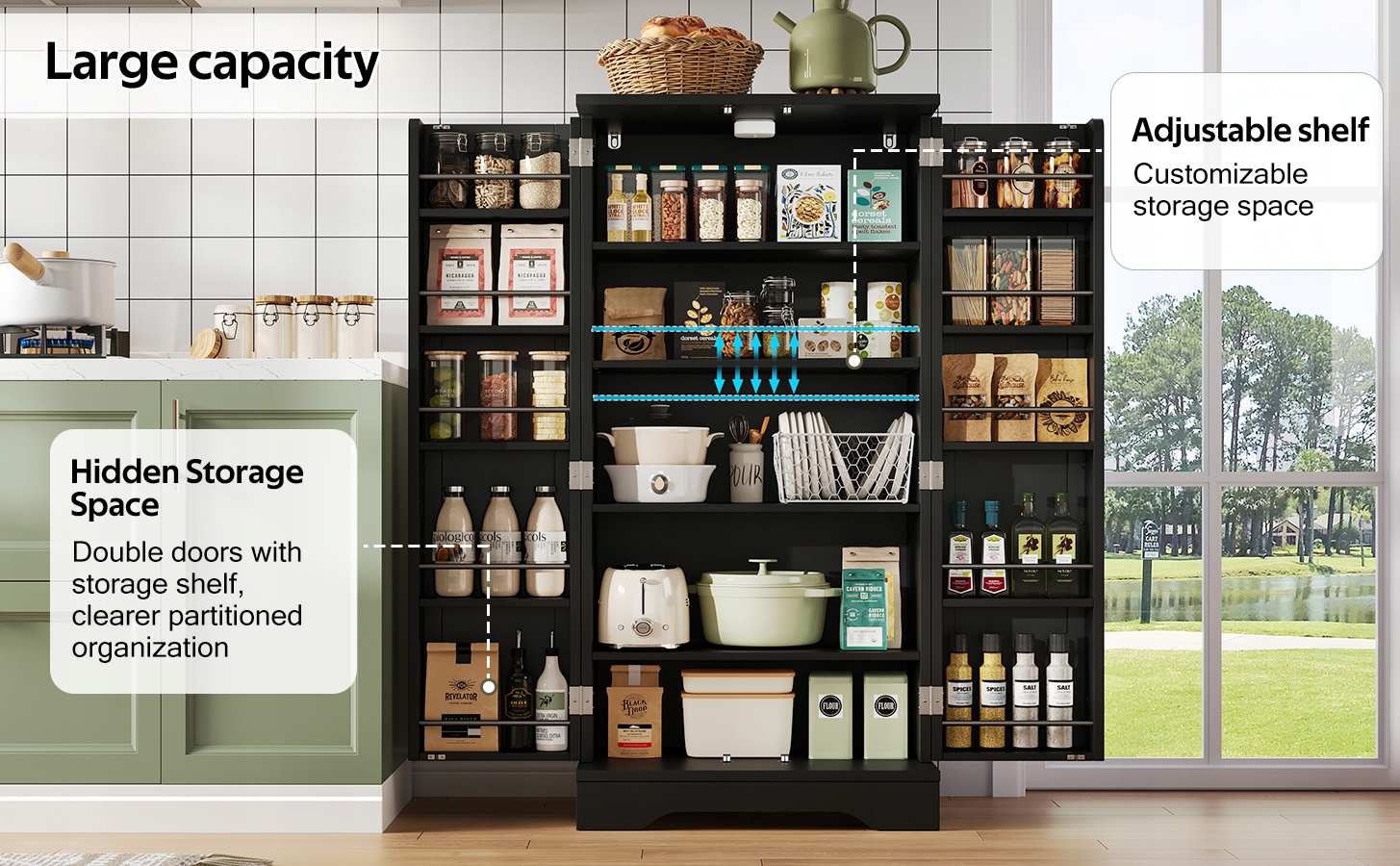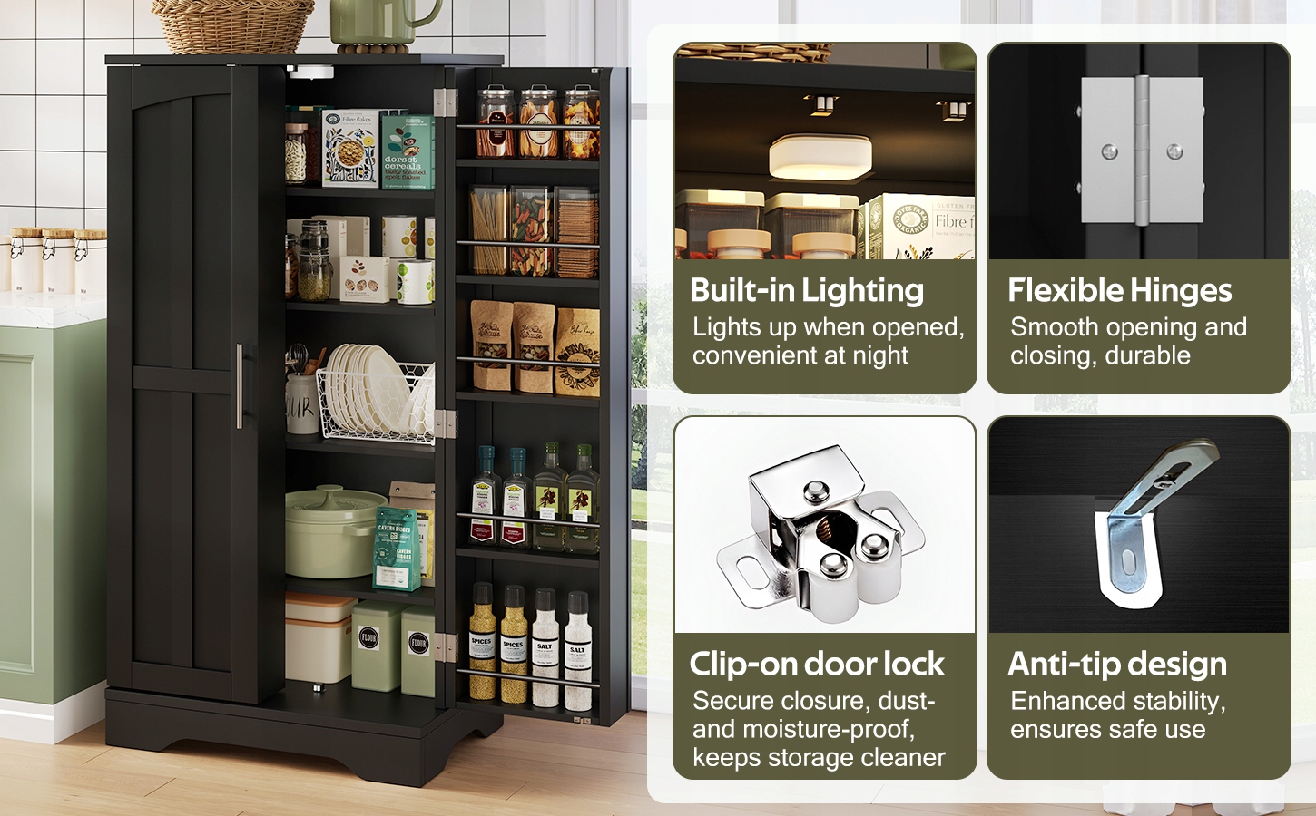 - Розширена основа збільшує несучу здатність, а захист від перекидання ззаду забезпечує додаткову безпеку. Замок із застібкою є більш стабільним, ніж магнітна застібка, завдяки чому ви не пилите й охайні. Верхня полиця підходить для зберігання кавових машин, рослин та інших повсякденних речей, оптимізуючи використання простору.