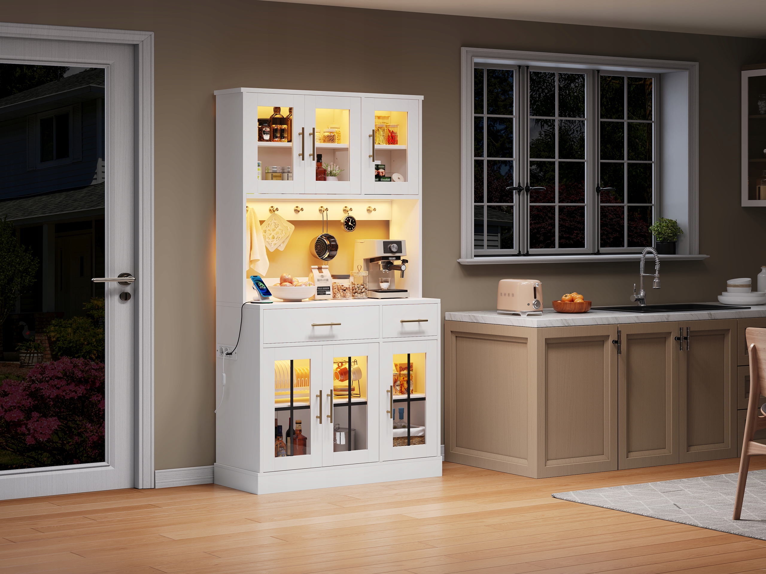 Кухонна тумба зі світлодіодною стрічкою та розеткою, оснащена 6 дверцятами та 2 ящиками, регульованими полицями для гнучкого зберігання, сільський дизайн, золотисті металеві ручки, білий, 180 x 100
