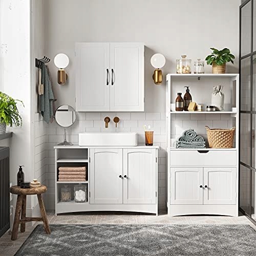 Порада для тих, хто шукає якості: МДФ преміум-класу (ДВП середньої щільності), гладка поверхня, яка легко миється, і чудова якість виготовлення роблять цю шафу під раковину ідеальною для тих, хто зосереджується на якості Говток свіжості у вашій ванній кімнаті: біле покриття, рифлені дверцята та хромовані металеві ручки надають цій шафі характерного вигляду. Це додасть освіжаючого акценту вашій ванній кімнаті! Повне зберігання: дивіться ліворуч! Відкрита шафа з 2 полицями, що регулюються по висоті (кожна має 3 висоти). У цих відкритих відділеннях ви можете зберігати часто використовувані предмети, такі як гребінці та парфуми під рукою Вам також потрібен закритий склад? Подивіться направо! Це дводверна шафа з полицею, яка має 3 регулювання висоти. Потрібно сховати зайві рушники та туалетний папір подалі від очей? Ця шафа під раковиною допоможе вам! Легка збірка: не схильні до збірки? Розслабся! Завдяки легким для читання, ілюстрованим інструкціям і пронумерованим частинам, що входять до комплекту, ви можете зібрати тумбу під умивальник без будь-яких труднощів. Технічні дані: колір: білий матеріал: МДФ плита (ДВП середньої щільності), хромована ручка Розмір виробу: 90 х 30 х 60 см (Д х Ш х В) вага виробу: 13,5 кг Вміст упаковки: 1 х тумба під раковину 1 х набір аксесуарів 2 x захисний набір наконечників 1 x посібник