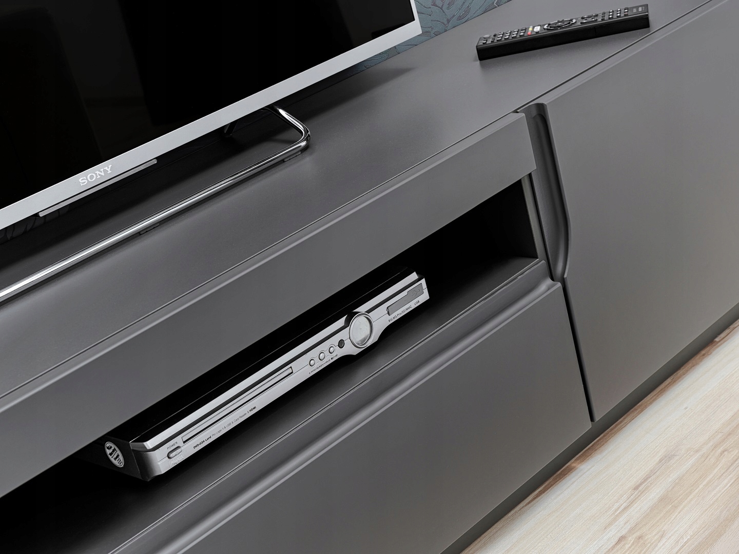 Телевізійна тумба ESTON - ідеальне рішення для вітальні, яке додасть стилю та сучасності. Використані графітові, матові кольори додадуть інтер’єру вишуканості та елегантності. Проста форма була збагачена профільованими краями, які також служать дверними ручками. Меблі функціональні та місткі. Має три закритих відділення та відкриту полицю, на якій належним чином розміститься електроніка. Стільниця добре підійде як місце для розміщення екрану телевізора.