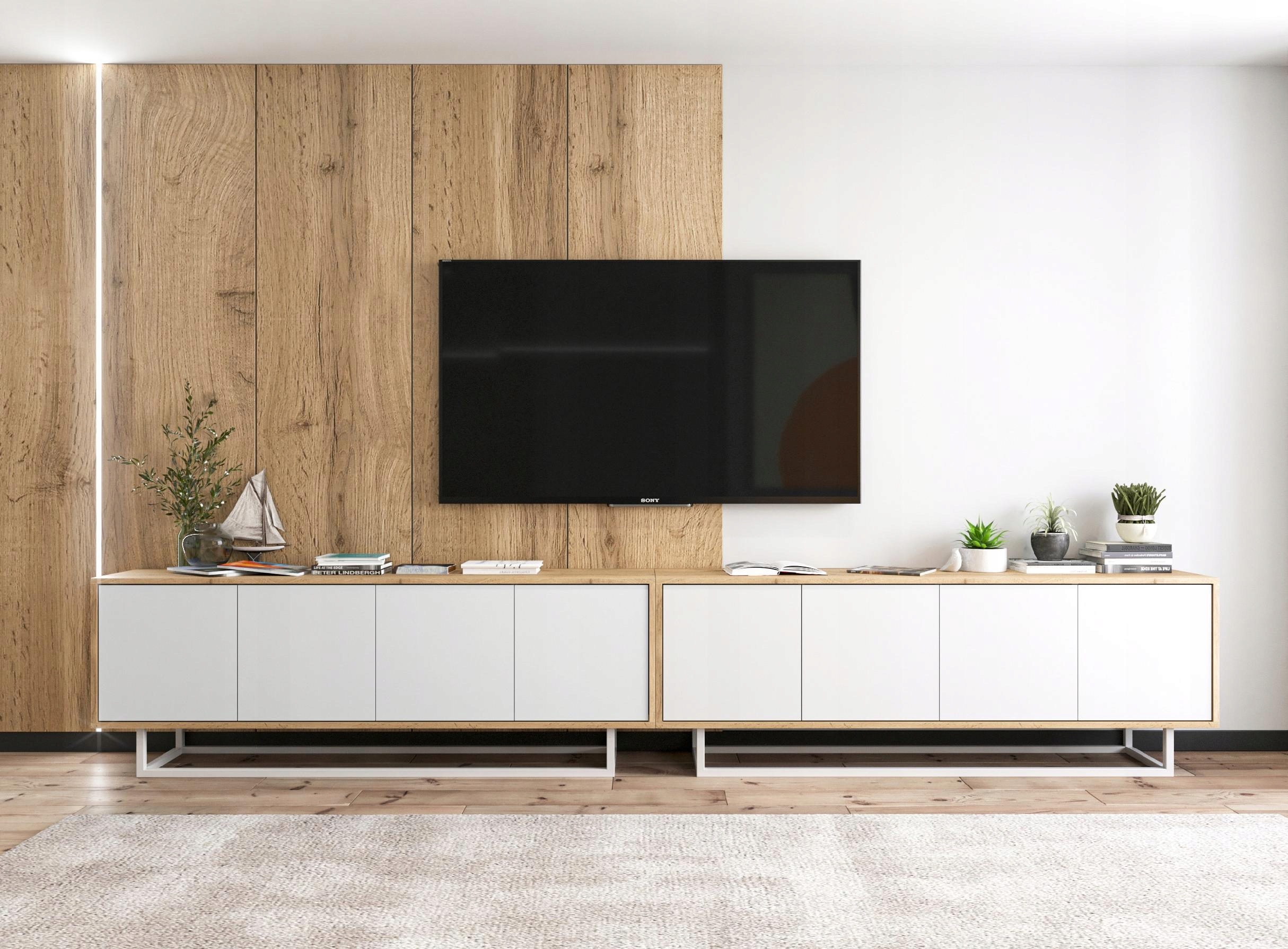 Дві підвісні тумби під ТВ в стилі Лофт з колекції APOLLO ідеально підійдуть для розміщення телевізора і підійдуть до будь-якого інтер'єру. Розташовані поруч, вони утворюють один довгий, дуже гарний предмет меблів. Вони мають чотири функціональні камери, що замикаються, розділені на два рівні. Зручна система відкриття дверей "push to open".