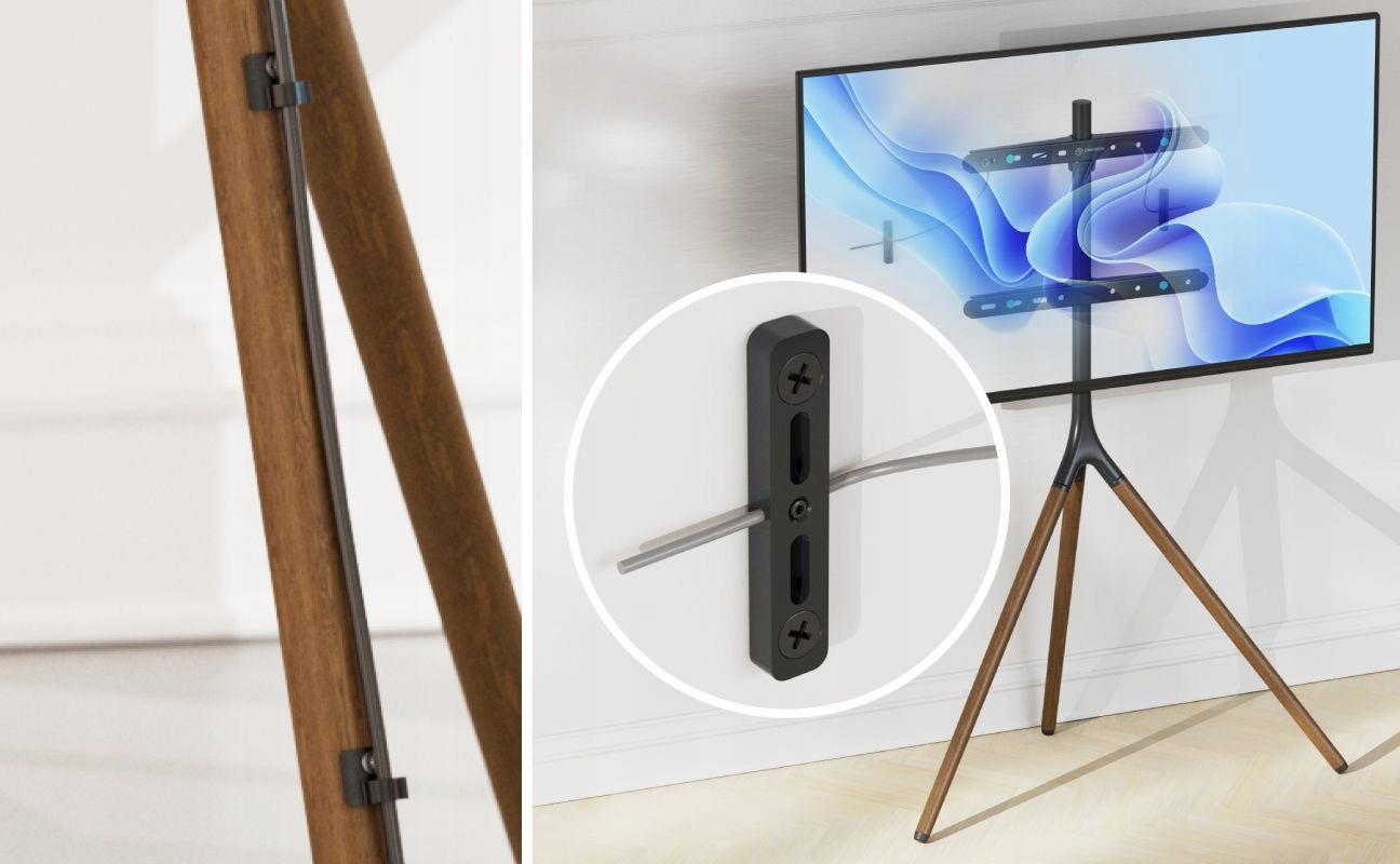 Телевізійна підставка з поворотом на 360° дозволяє розташувати екран горизонтально або вертикально. Тринога TV Stand дозволяє регулювати кут нахилу екрана, зменшуючи відблиски та покращуючи комфорт перегляду. Завдяки цьому дерев'яна тумба під телевізор підходить як для щоденного використання, так і для презентацій та заходів.
