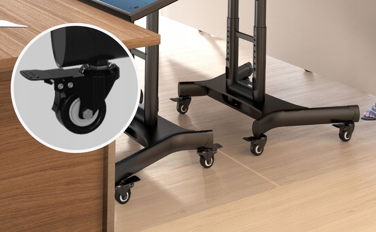 Виріб розроблено для інтуїтивно зрозумілого та безпечного використання. Підставка під телевізор стійка, а захисні вставки захищають задню частину екрана від подряпин. Конструкція гарантує зручність використання в школах, офісах, конференц-залах і комерційних приміщеннях, а мобільна підставка для телевізора дозволяє легко переміщати та універсально використовувати.