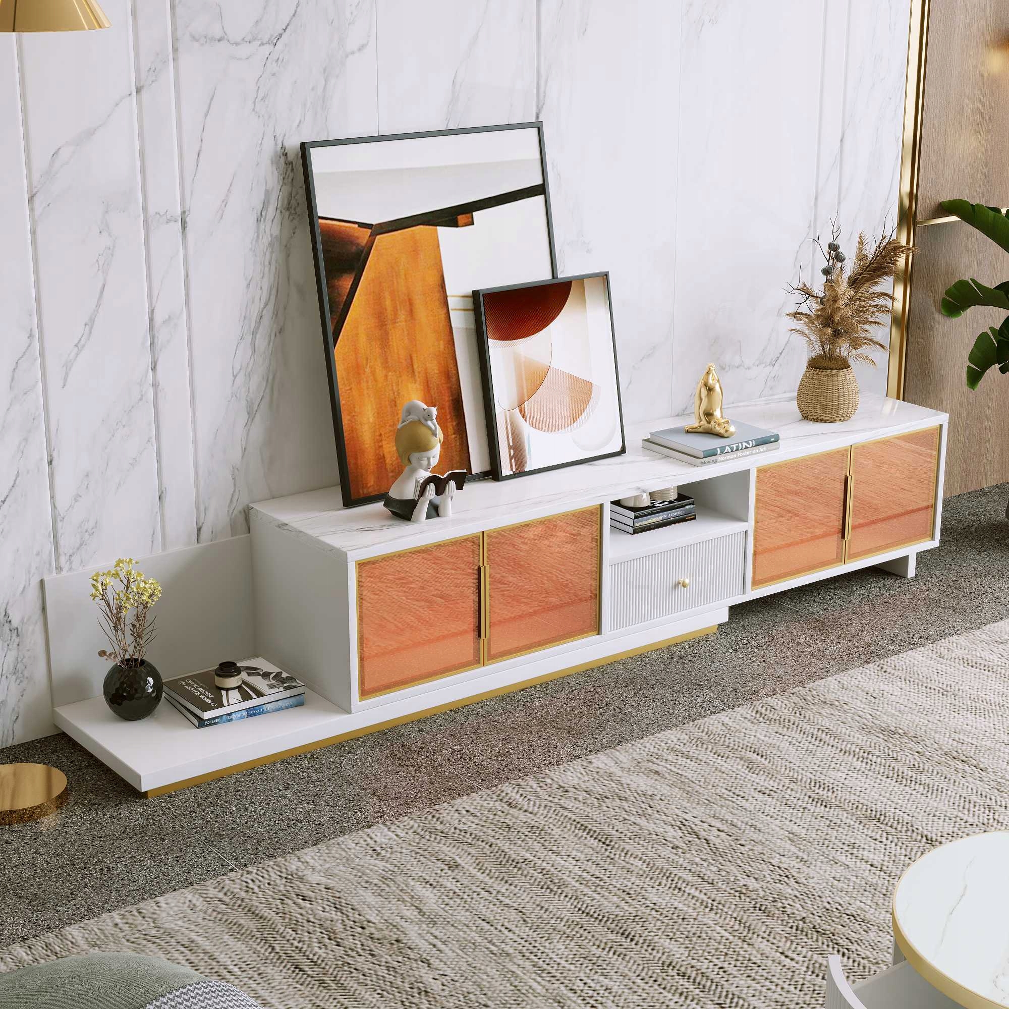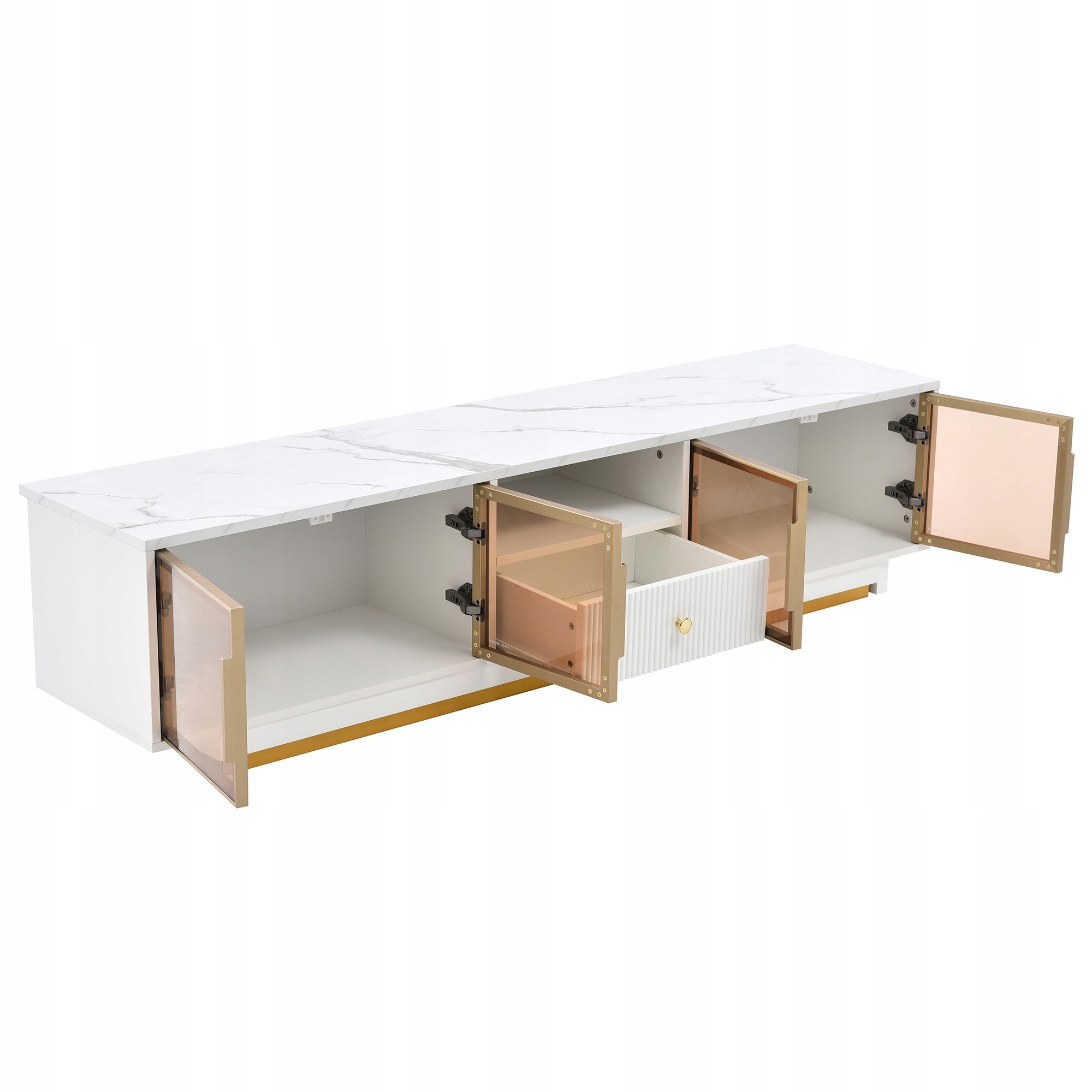 Все ще хвилюєтеся, як знайти відповідну підставку для телевізора? Спробуйте цю регульовану підставку для телевізора, яку можна вільно регулювати від 170 см до 315 см або залежно від розміру вашої вітальні. Є чотири дверцята, один ящик і одне відділення, які забезпечують потужну функцію зберігання. Ця тумба під телевізор має не тільки гарну функціональність, але і гарний зовнішній вигляд. Ідеальне поєднання мармурової стільниці, коричневого загартованого скла та золотої ручки є елегантним і розкішним. У той же час текстура на поверхні ящика додає виробу художній відтінок. Завдяки світлодіодній смузі зі змінним кольором ви можете налаштовувати різні кольори за бажанням.