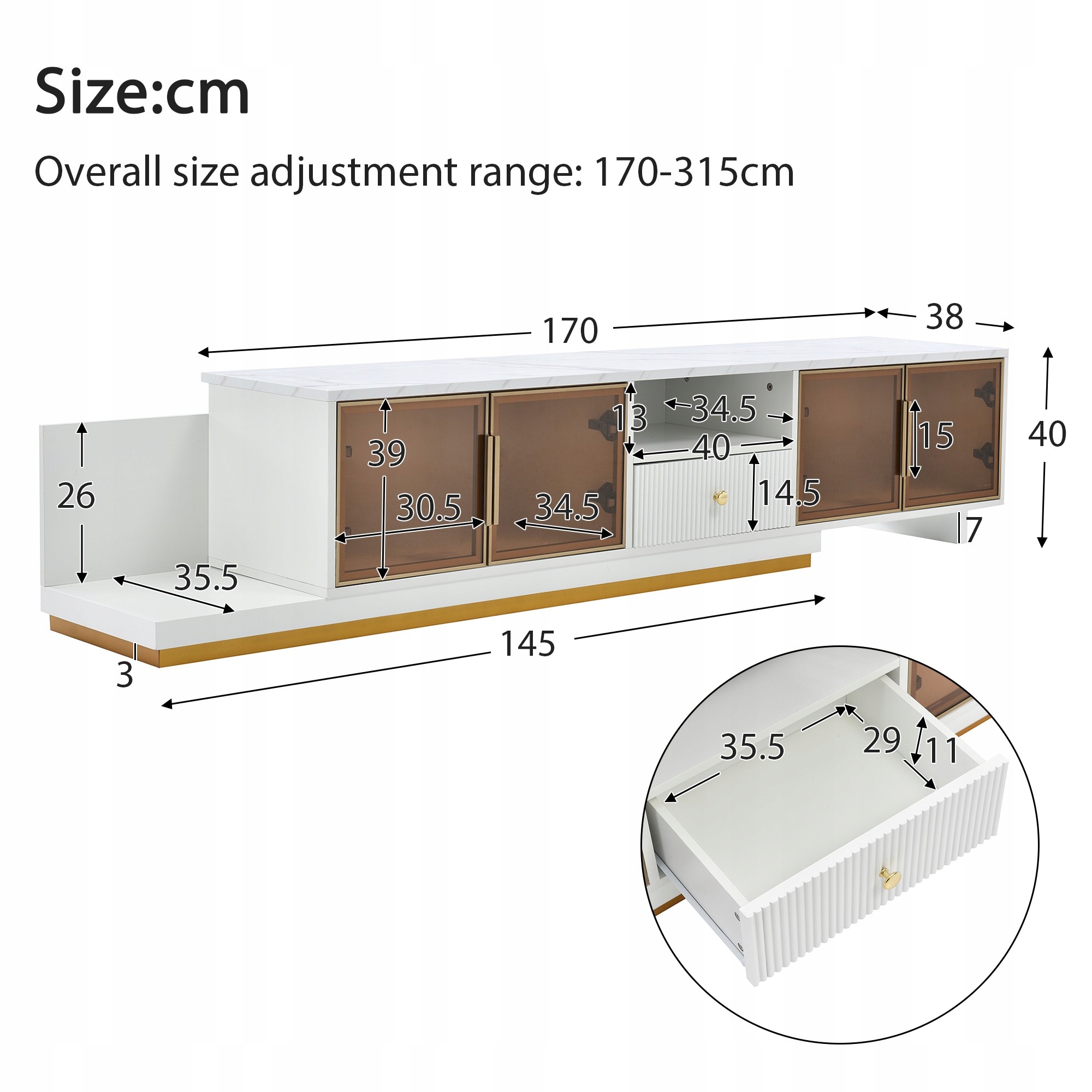[Регульована довжина] Унікальна конструкція push-pull дозволяє змінювати довжину тумби для телевізора та змінний діапазон 170-315 см. Ви можете вибрати довжину відповідно до площі вашої вітальні.