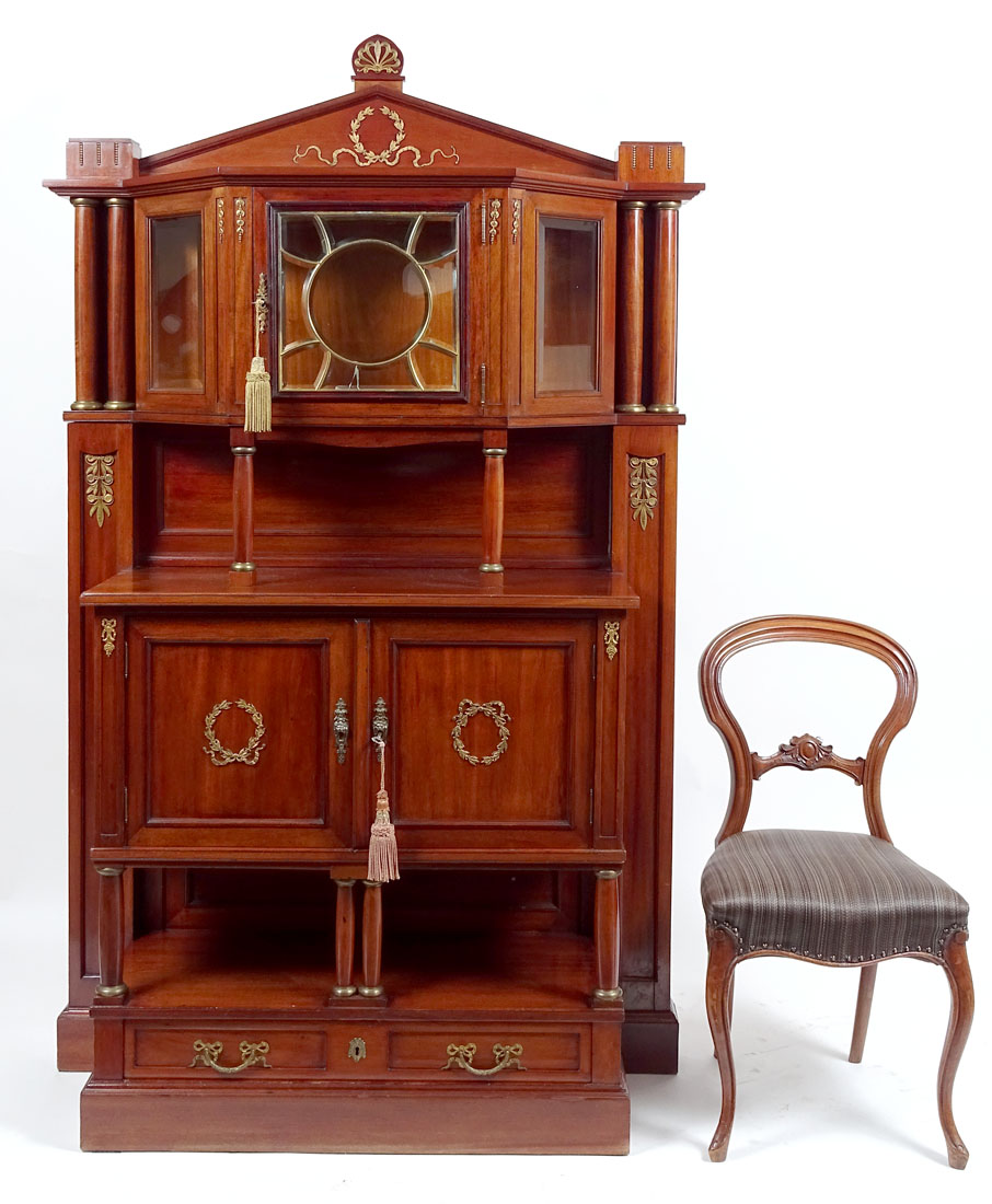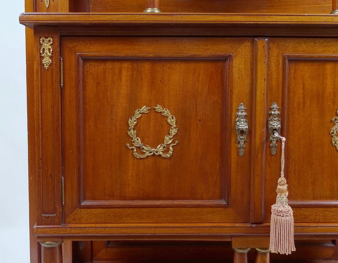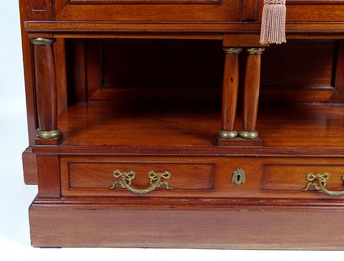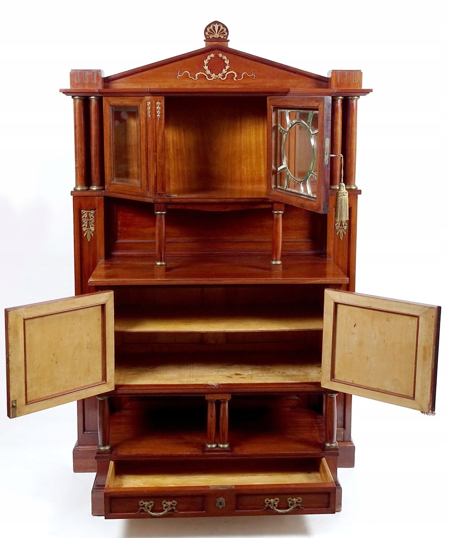 з прямокутною основою та розширеними боками ззаду. У верхній частині з коробкою, з заскленими дверима зі скошеним склом і латунними стійками, з боків дві точені колони, над нею широка трикутна смуга. Нижче — шафа з парою цільних дверцят із заглибленими панелями, прикрашена латунними лавровими вінками. Шафа підтримується внизу чотирма колонами, з шухлядою посередині, з замком і двома шухлядами на лицьовій стороні. Тумба, прикрашена багатьма латунними аплікаціями, одне скло в дверцятах розбите.