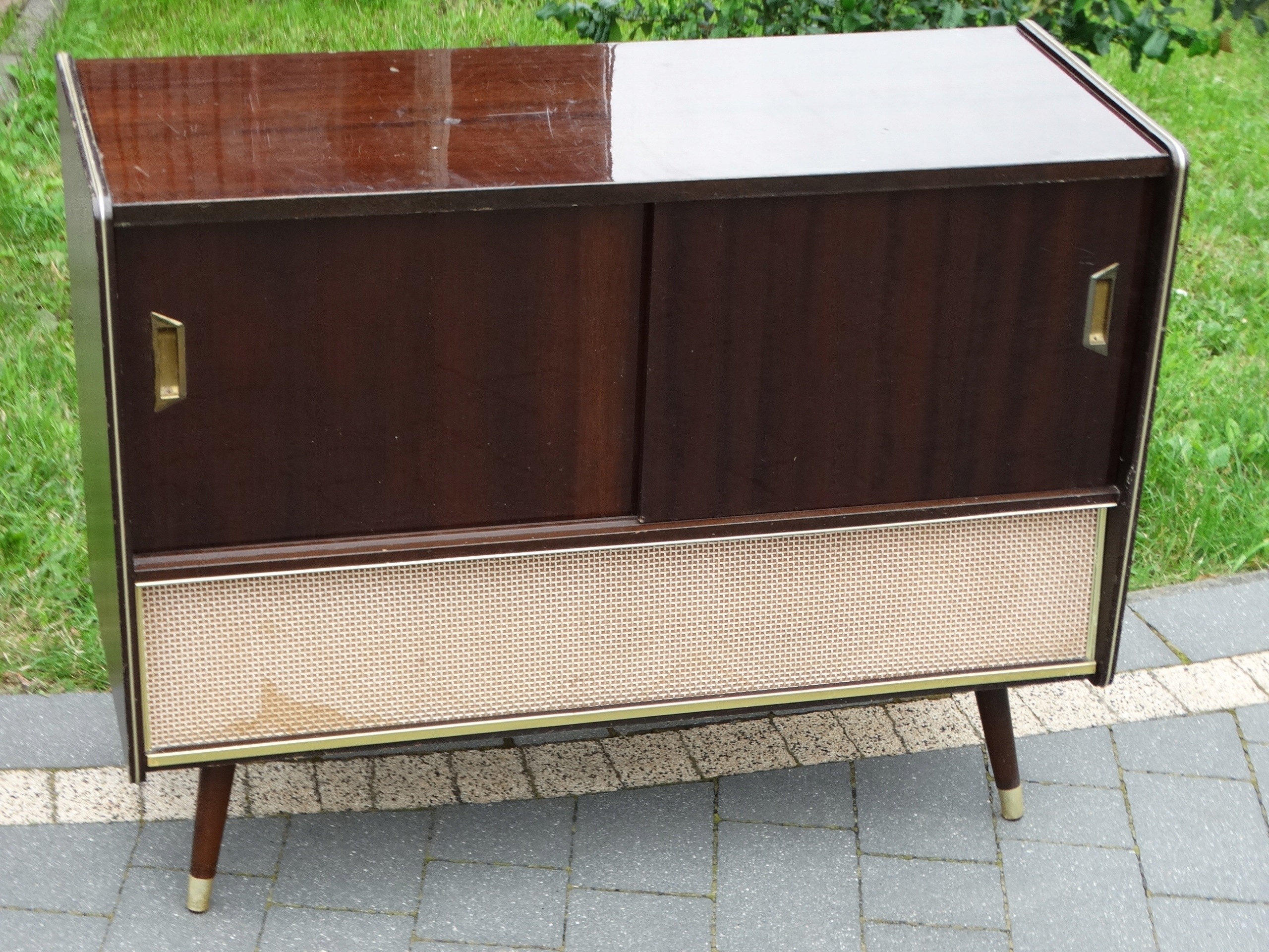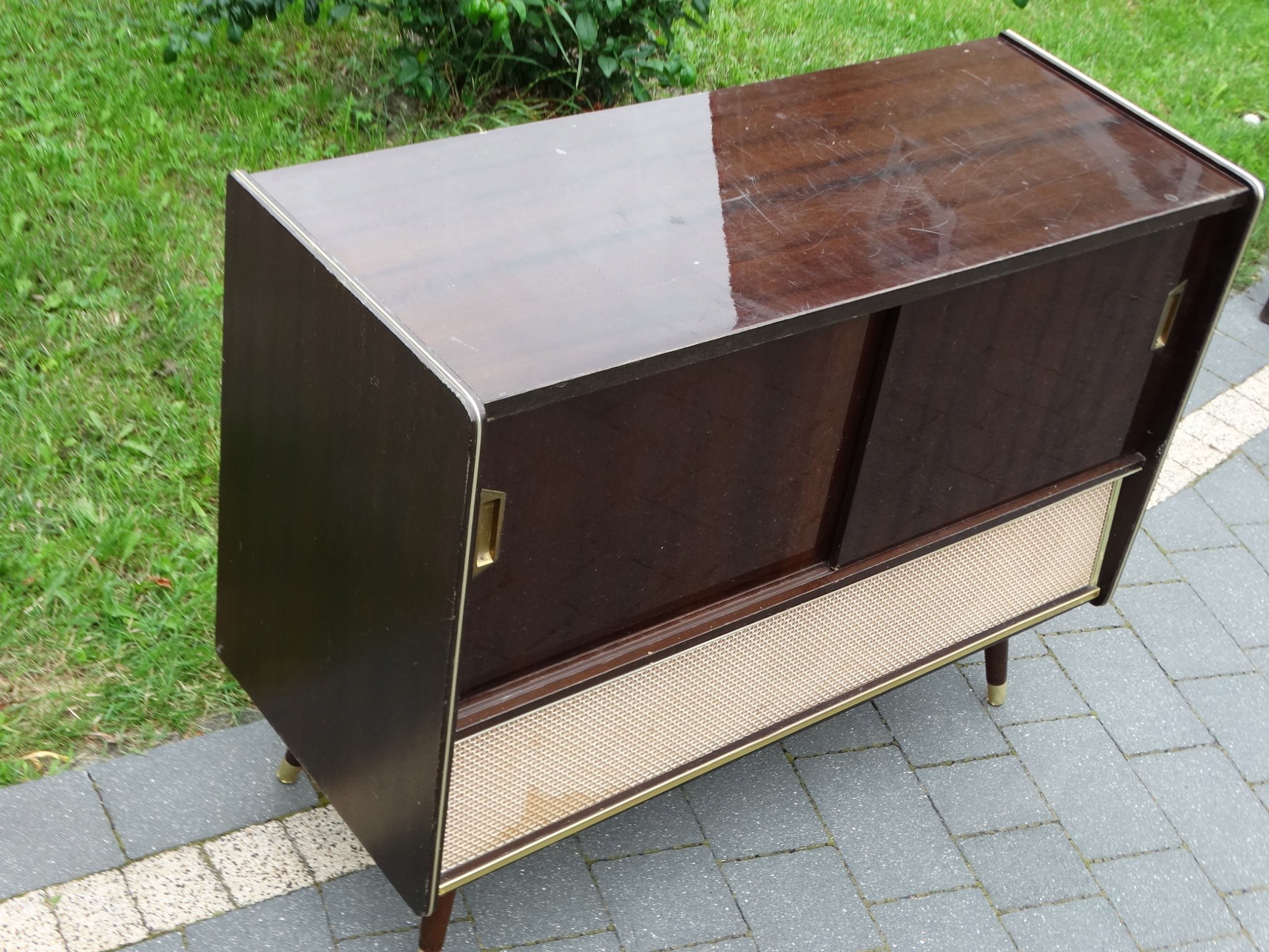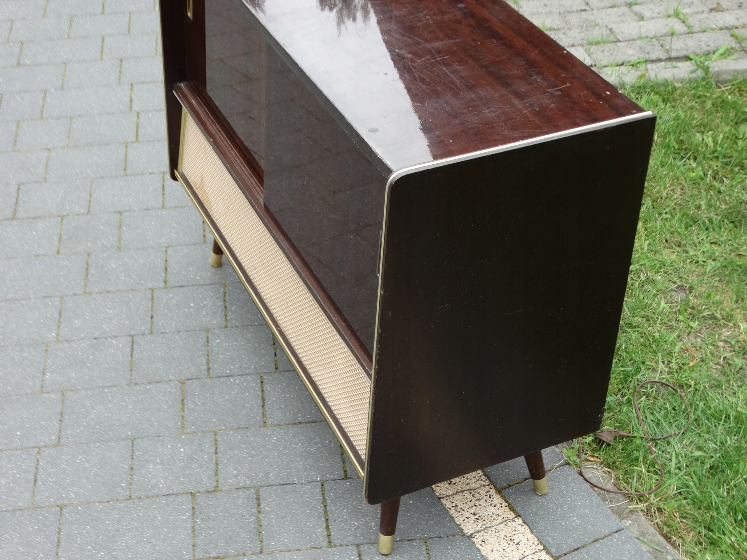 Шафа з радіо та програвачем RETRO/VINTAGE Шафа минулої епохи, як видно на фотографіях, у хорошому стані, потребує незначного ремонту. Глянцева шафа на ніжках з розсувними дверима, радіо (невідомої марки) і програвач PE 66 з автоматом для запису. Радіо працює, гра приймає станції, мелодії - вертушка теж працює, чейнджер працює, механічно і звуково все працює, ок. У нижній частині шафи встановлений динамік. Я запрошую вас ознайомитися з тестом на аудіювання і, звичайно, придбати його. Ласкаво просимо.