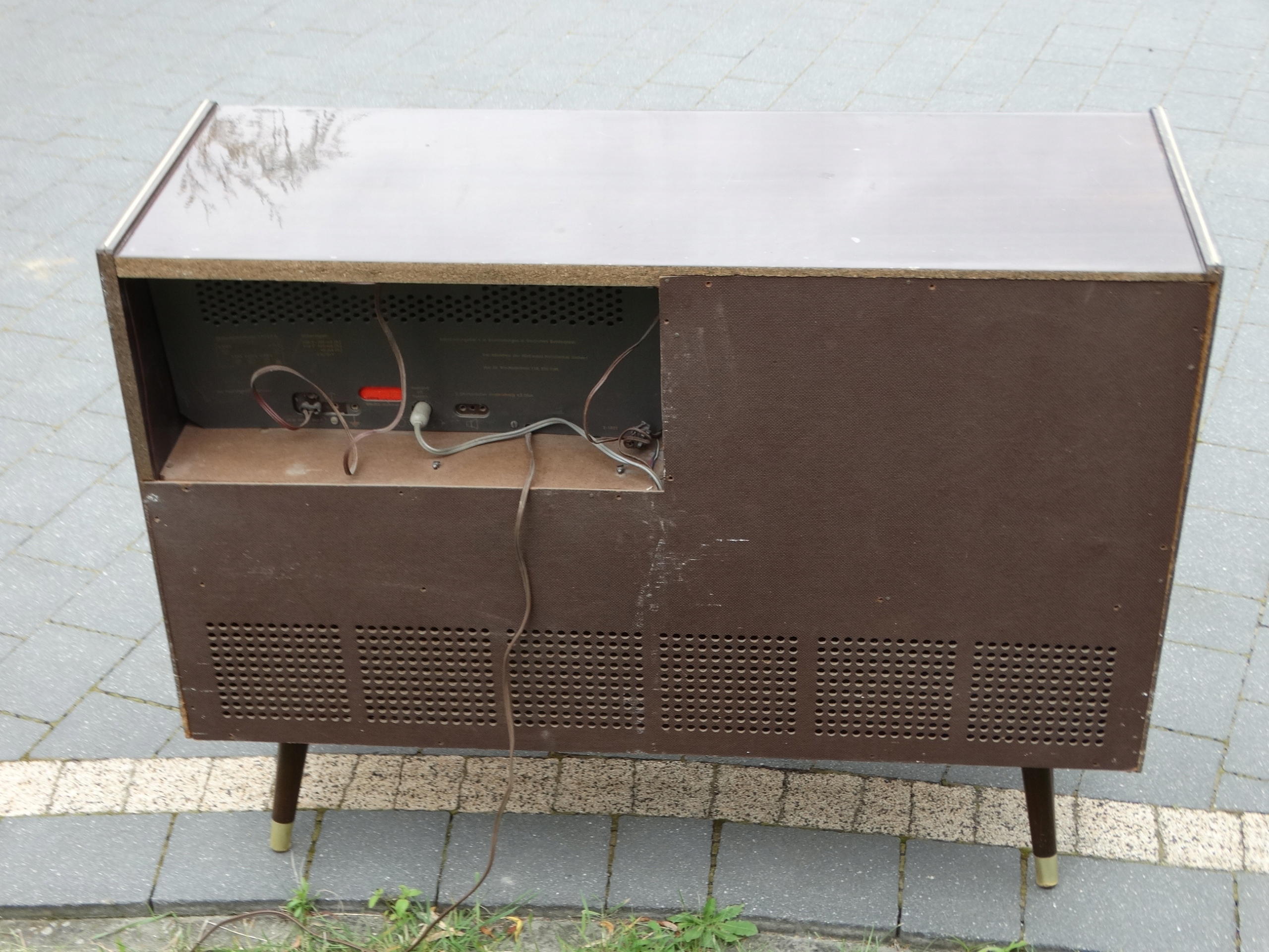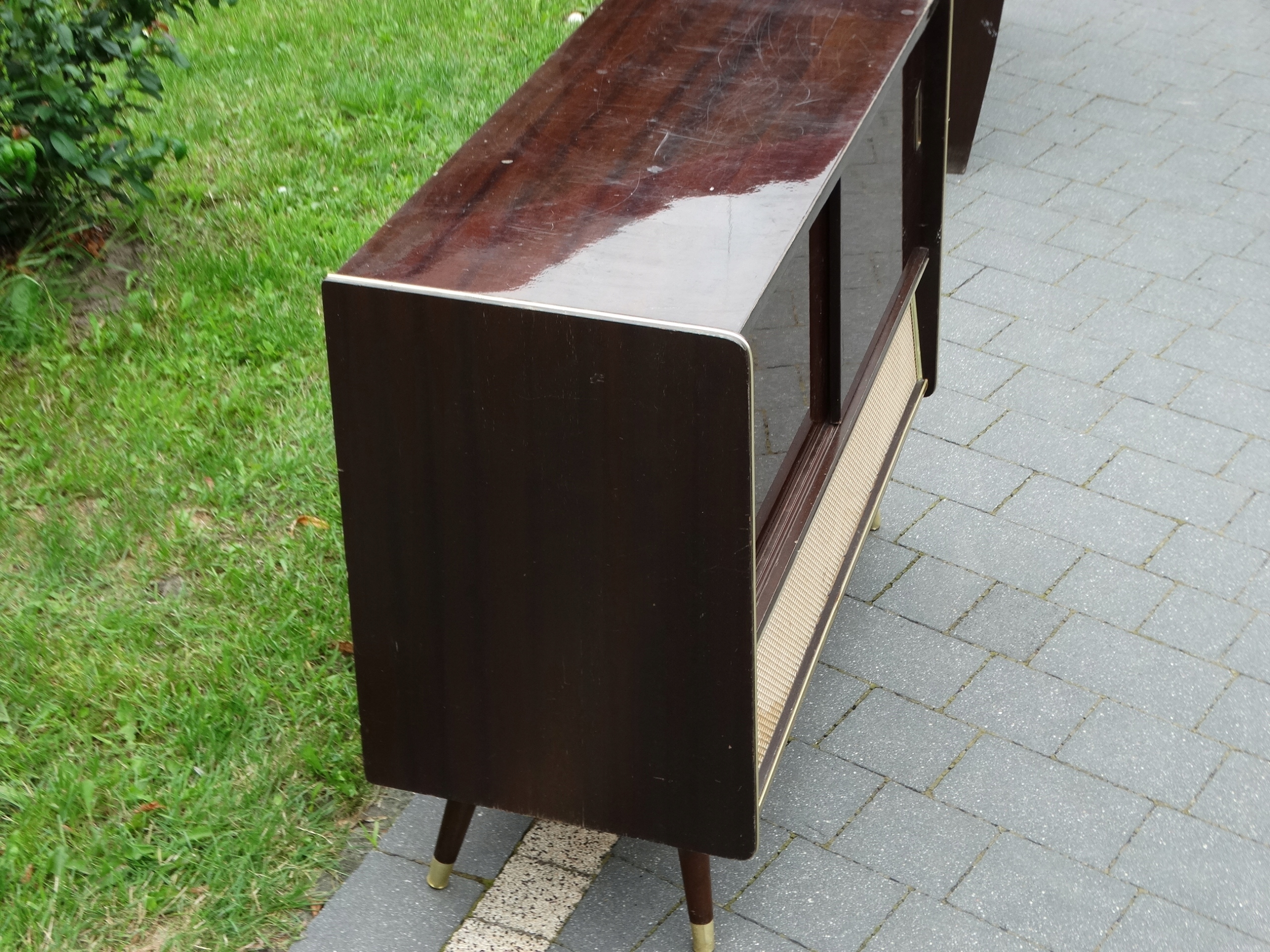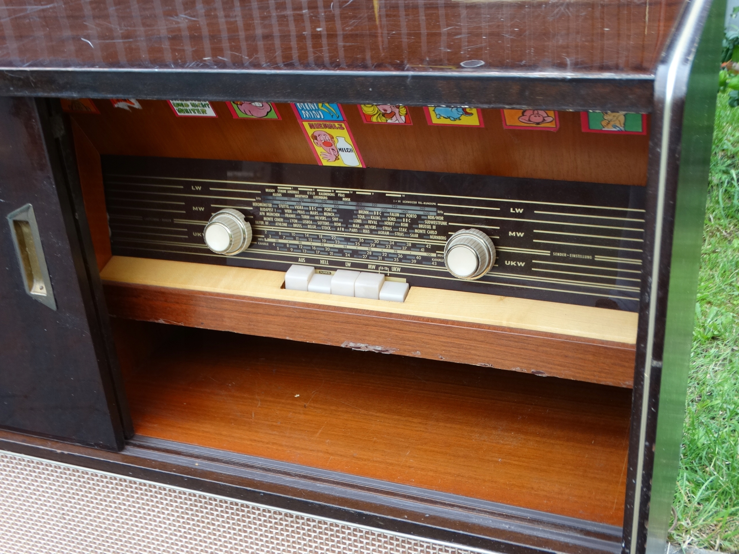 Шафа з радіо та програвачем RETRO/VINTAGE Шафа минулої епохи, як видно на фотографіях, у хорошому стані, потребує незначного ремонту. Глянцева шафа на ніжках з розсувними дверима, радіо (невідомої марки) і програвач PE 66 з автоматом для запису. Радіо працює, гра приймає станції, мелодії - вертушка теж працює, чейнджер працює, механічно і звуково все працює, ок. У нижній частині шафи встановлений динамік. Я запрошую вас ознайомитися з тестом на аудіювання і, звичайно, придбати його. Ласкаво просимо.