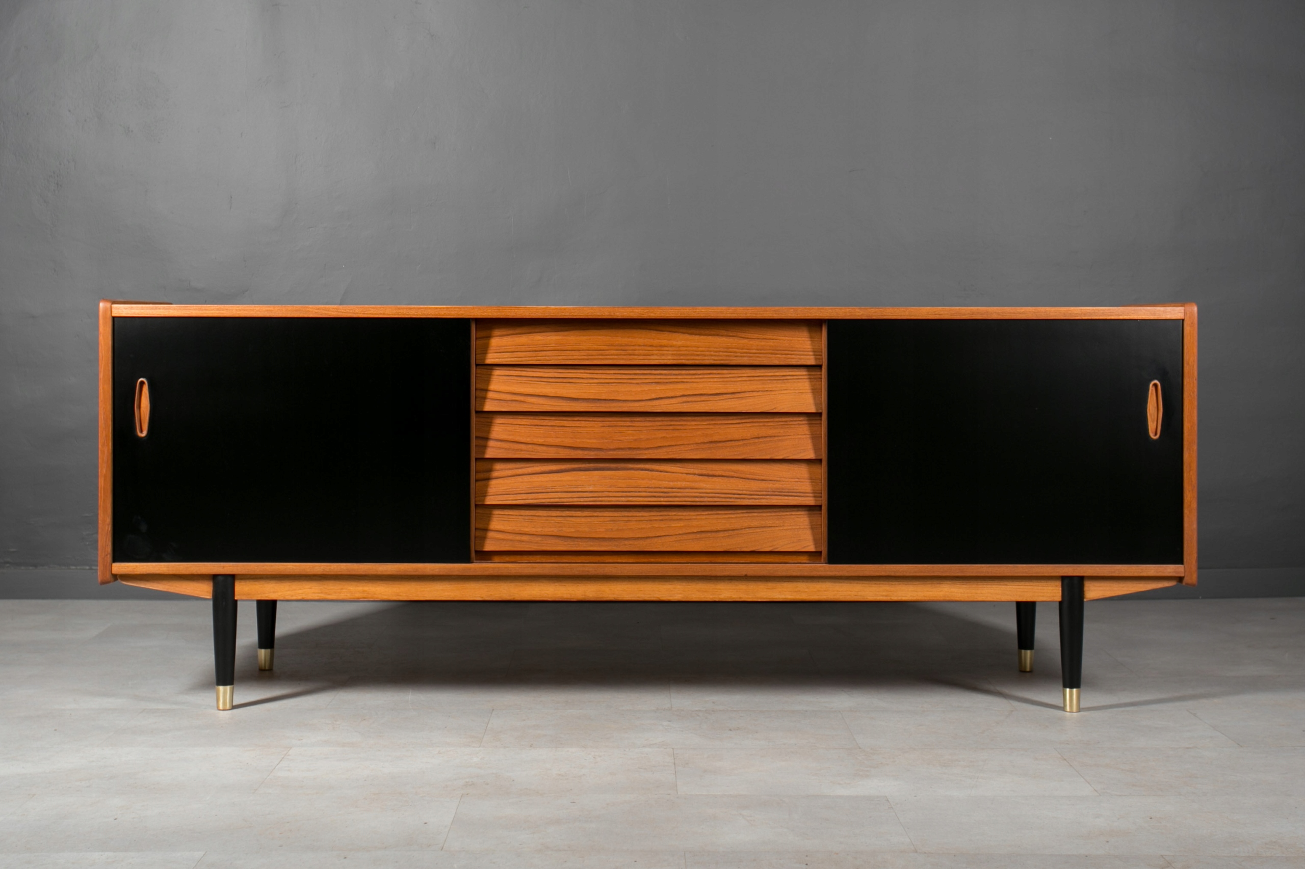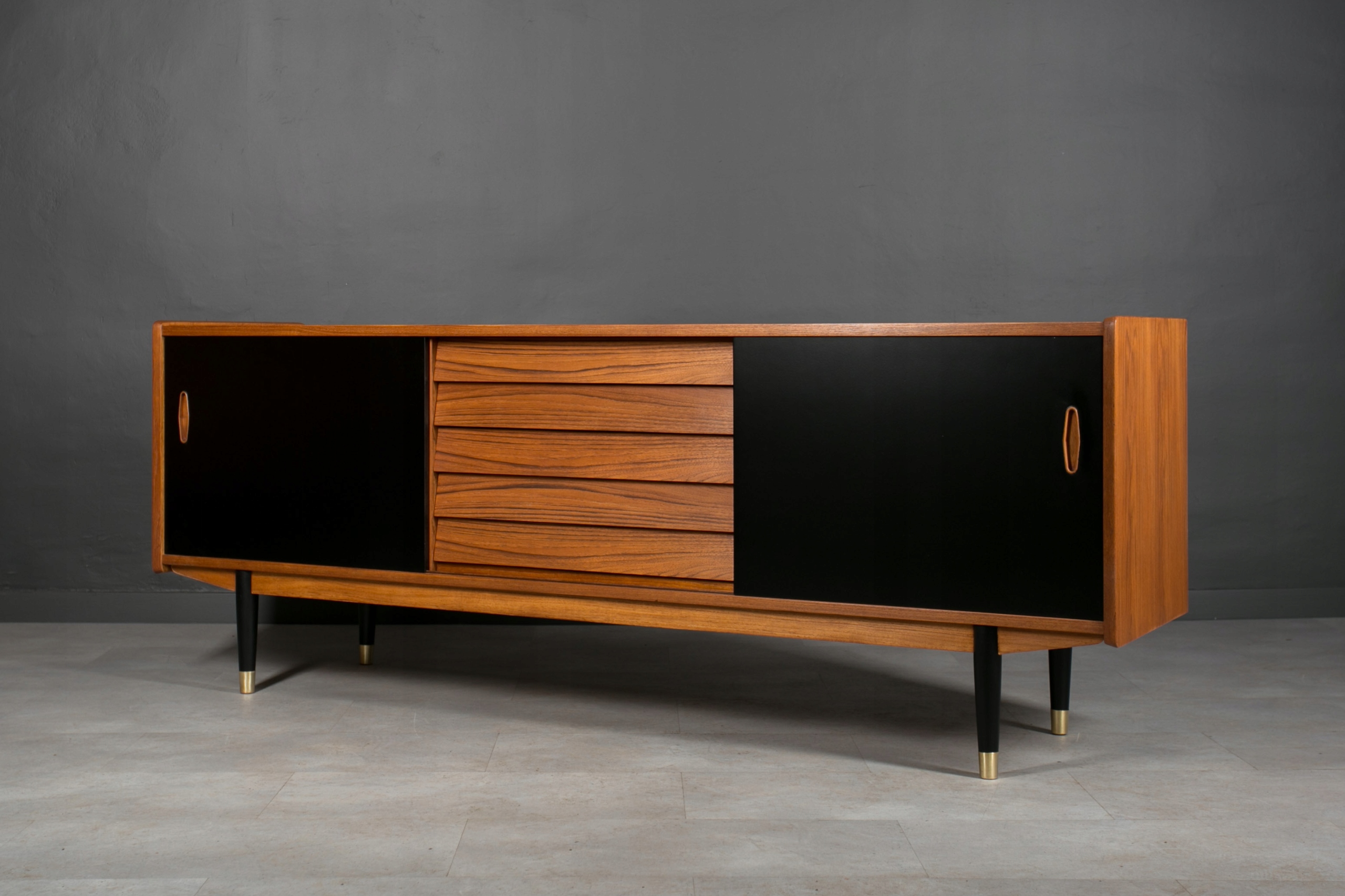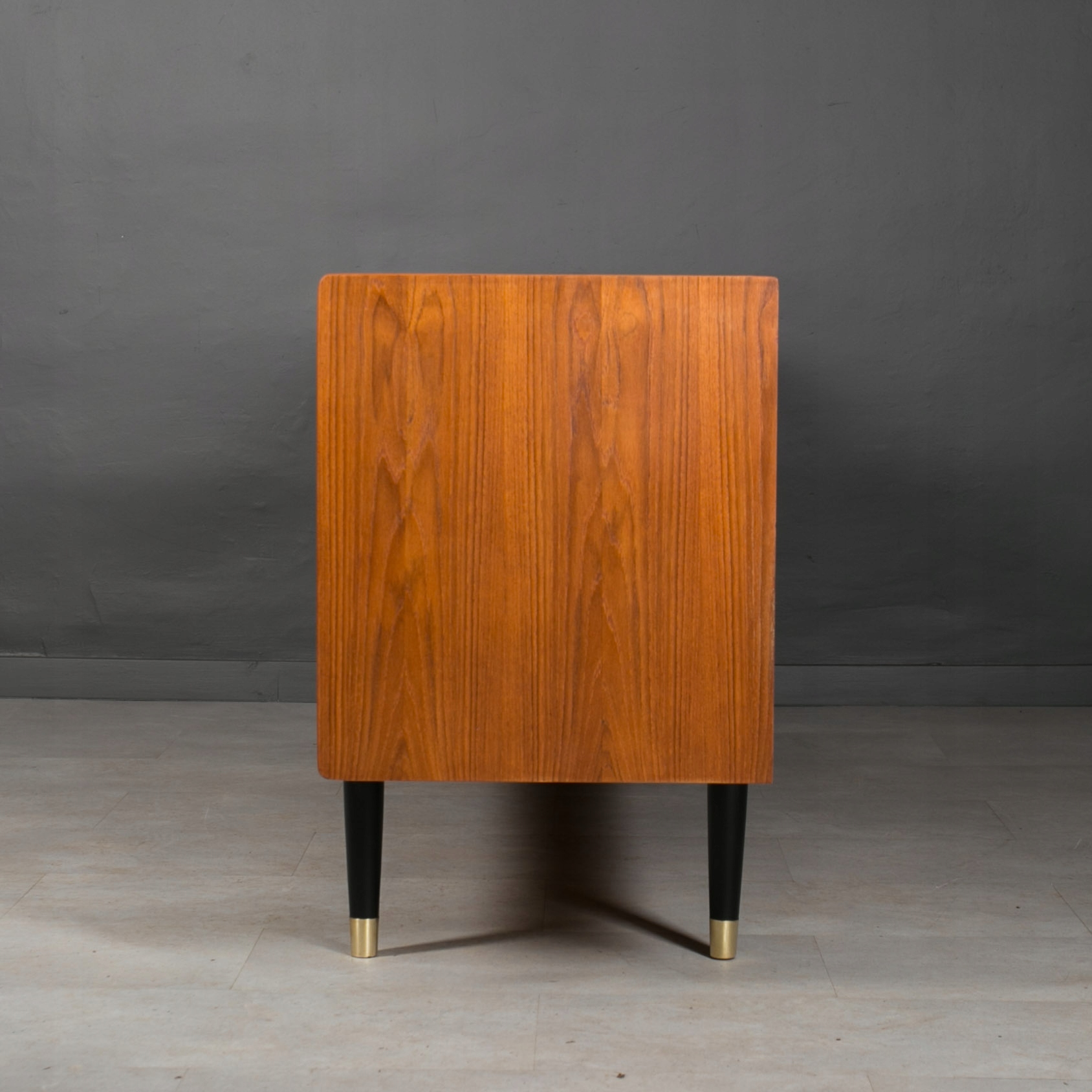 Тикова тумба від Нільса Йонссона з чорними розсувними дверцятами, різьбленою ручкою, елегантною чорною основою, доповненою витонченими латунними ніжками – чудовий приклад скандинавського сучасного стилю в найкращому вигляді. Він був розроблений для знаменитої фабрики Hugo Troeds Mobelfabrik. Легко розсувні двері відкривають простір з полицею ліворуч і секцією з п’ятьма ящиками праворуч. Його розмір робить його дуже універсальним предметом меблів, який можна використовувати практично скрізь: в їдальні як сервант або буфет, у спальні як комод, у вітальні як барну стійку або мультимедійну приставку. Цей екземпляр було повністю відреставровано, змащено маслом і знаходиться у відмінному стані.