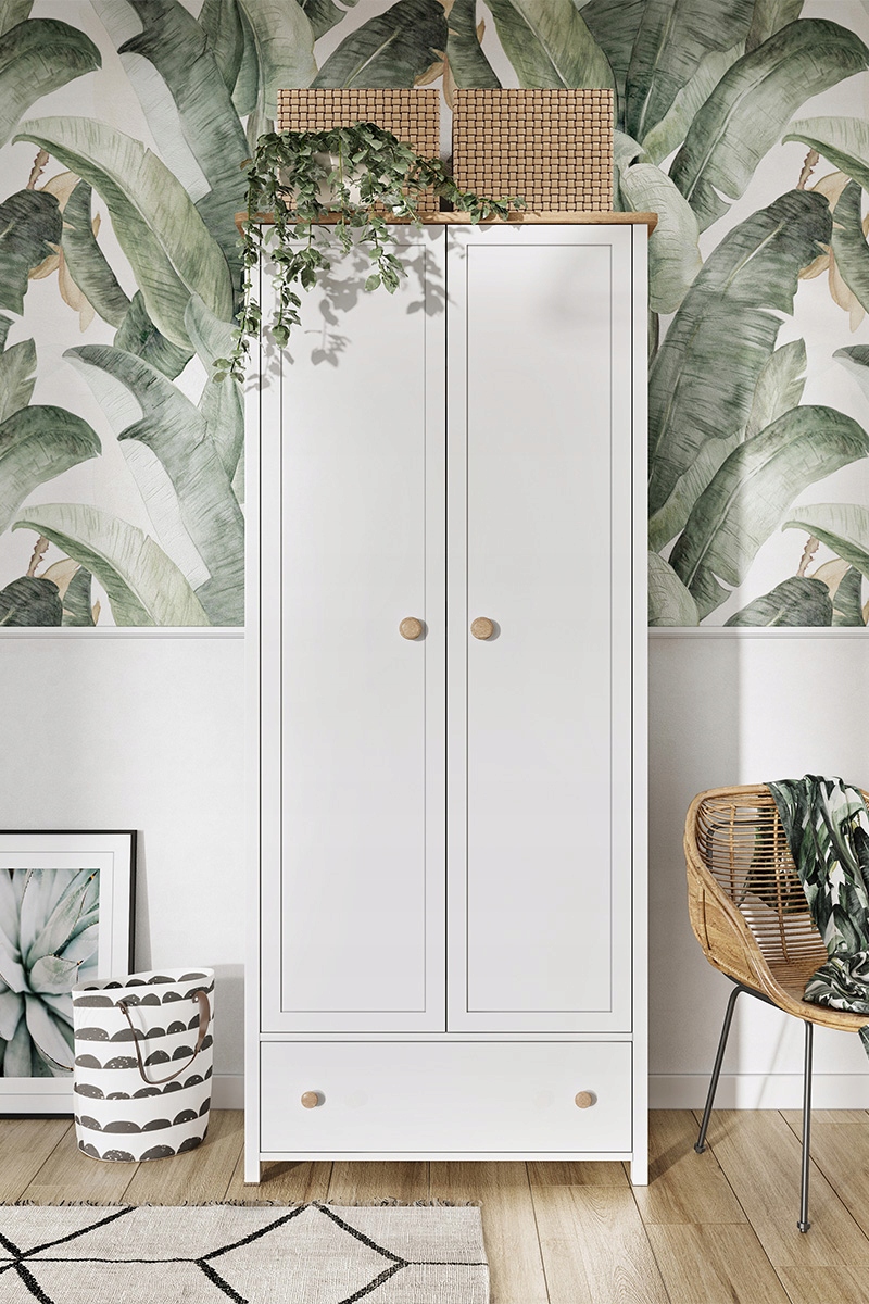 Колекція STORY підготовлена для облаштування спалень і молодіжних кімнат. Поєднання білого і світлого кольору дуба наш ідеально впишеться в будь-який декор, зігрівши приміщення. Колекція виготовлена з високоякісної, стійкої до пошкоджень ламінованої плити, обробленої міцним кромкою ABS. Ручки пластикові.