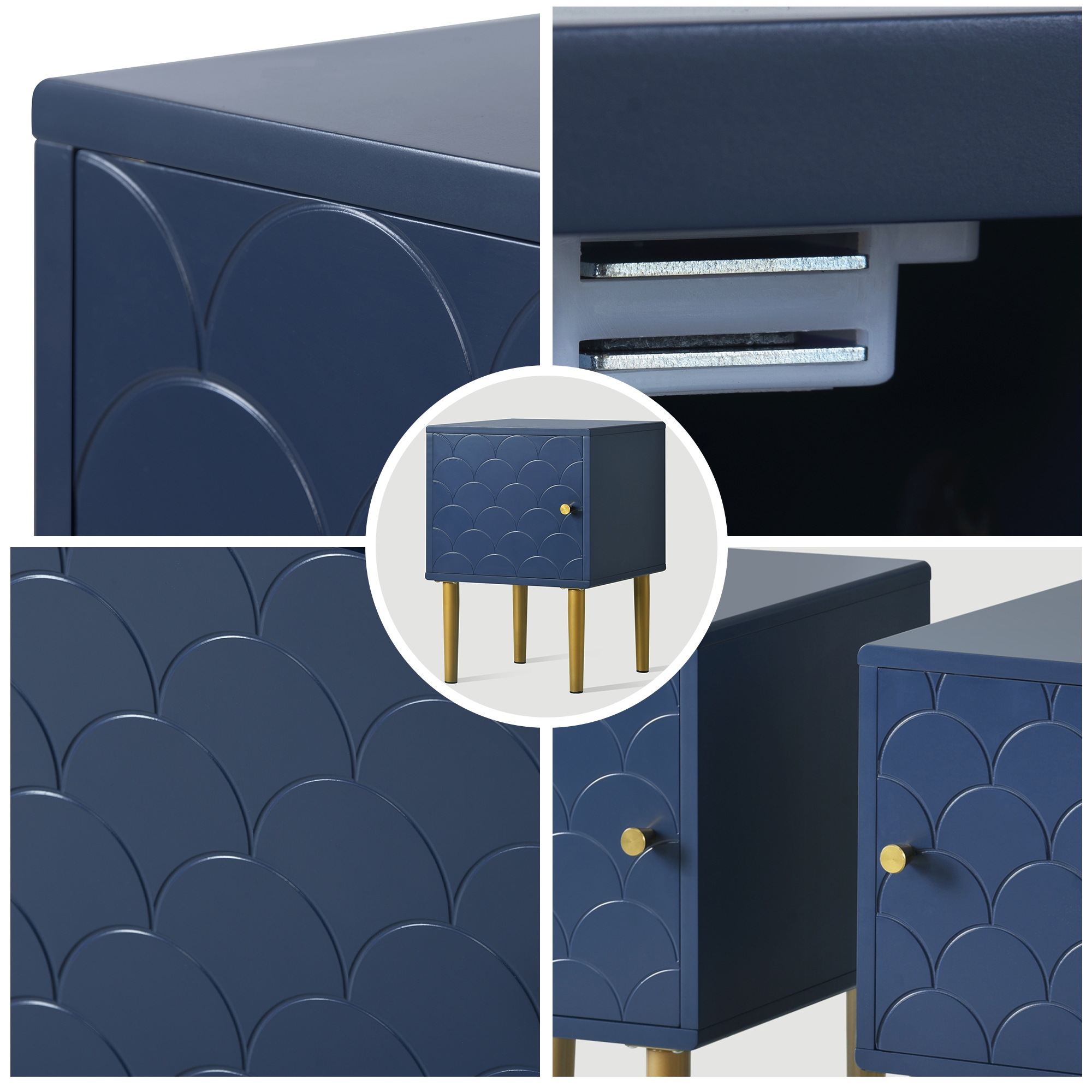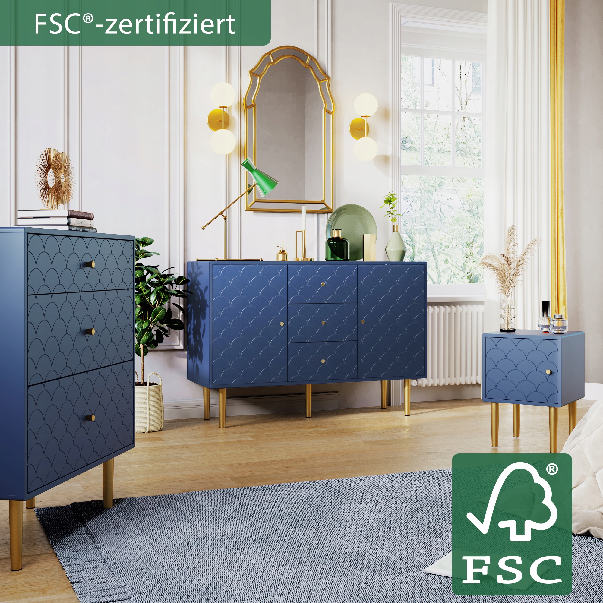 Темно-синій малюнок риб'ячої луски та металеві ніжки кольору шампанського надають цій шафі елегантний вигляд у спальні та вітальні.Виріб оснащено високоякісними металевими петлями, які дозволяють регулювати зазори між дверцятами та ящиками, надаючи панелі мають послідовний і більш естетичний малюнок риб’ячої луски .