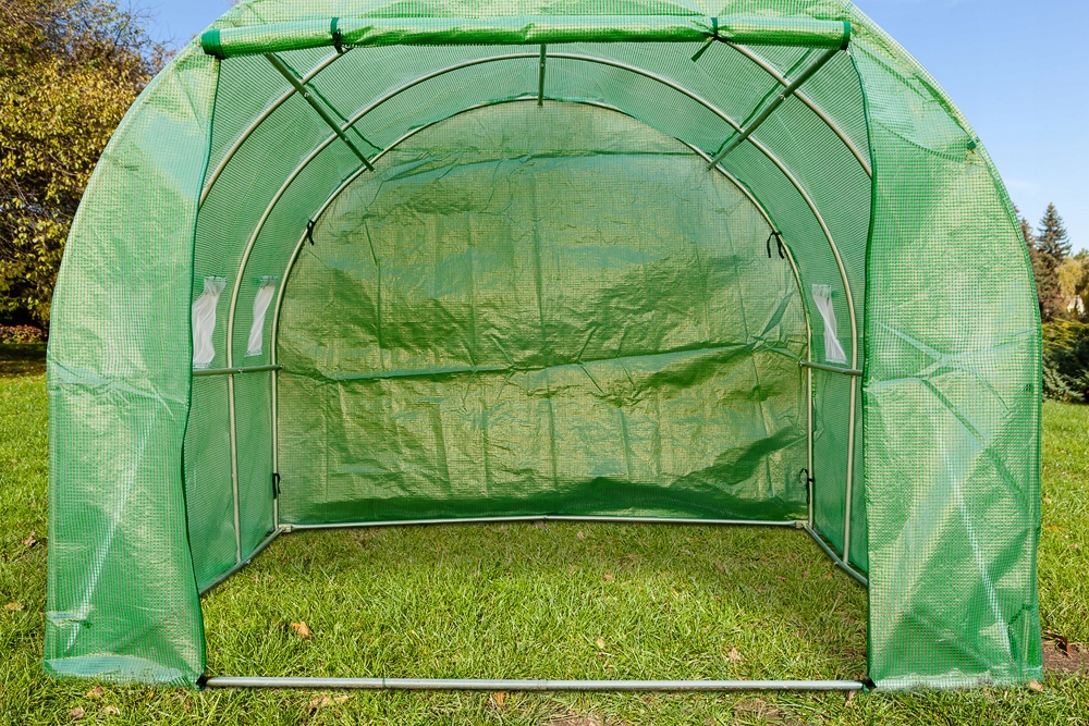 - широкі двері, що закриваються на блискавки, забезпечують легкий вхід в тунель, а висота 2 метри полегшує виконання робіт і дозволяє вирощувати в'юнкі рослини