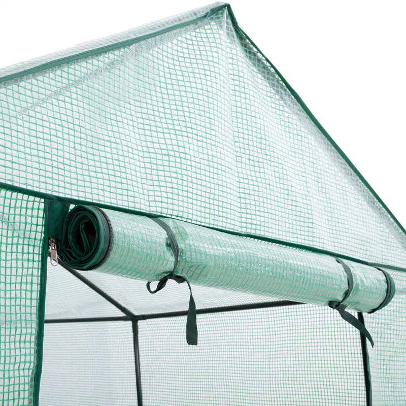 Швидка збірка без інструментів завдяки практичній системі заглушок. Плівка пропускає достатню кількість сонячного світла та забезпечує ідеальну циркуляцію повітря - якщо стане занадто жарко, просто відкрийте дверцята та загорніть їх. Усередині намету з фольги є дві стійкі полиці, що пропонують місце для невеликих рослин. На кожну полицю можна навантажувати до 10 кг. Нижній край кришки трохи довший за раму. Краї, що виступають, для підвищення стійкості рекомендується навантажувати землею або камінням. Для оптимального кріплення в комплект входять кабелі та анкери.