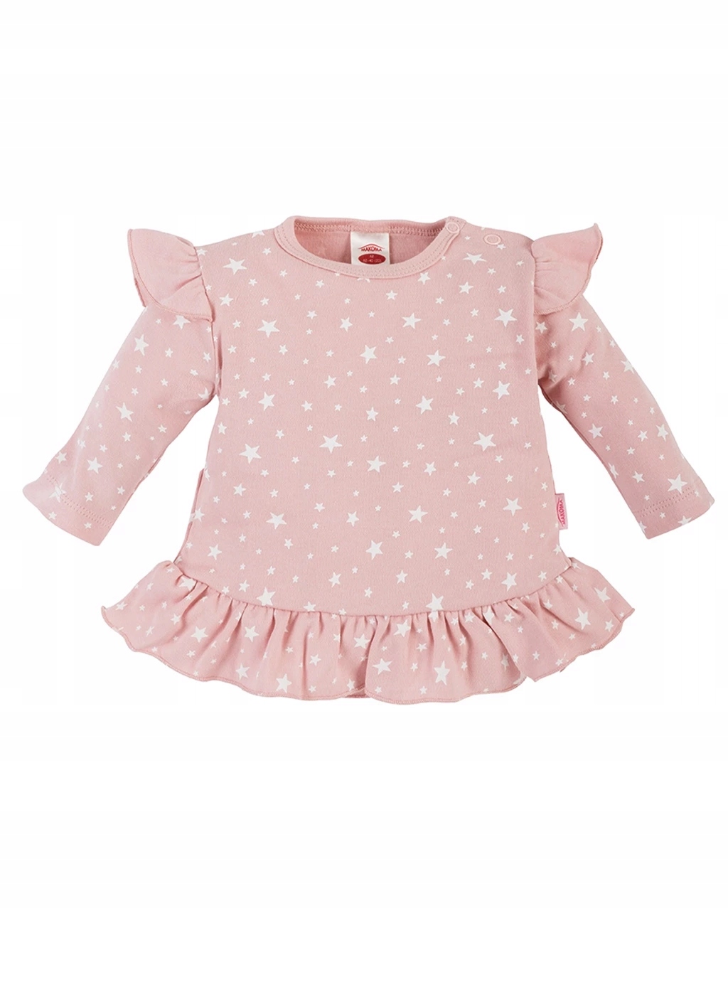 Туніка має милий волан як на талії, так і на рукавах. Він застібається на застібки без нікелю, тому ви можете бути впевнені, що він безпечний для вашої дитини. Бавовнянийодяг забезпечить дитині належну ізоляцію від холоду, не перекриваючи вільний потік повітря, таким чином усуваючи проблему потовиділення. Завдяки використаним натуральним матеріалам ми можемо бути впевнені в стані шкіри нашої дитини. Зручна туніка із зірковим принтом обов’язково повинна бути в гардеробі кожної маленької Зірки.