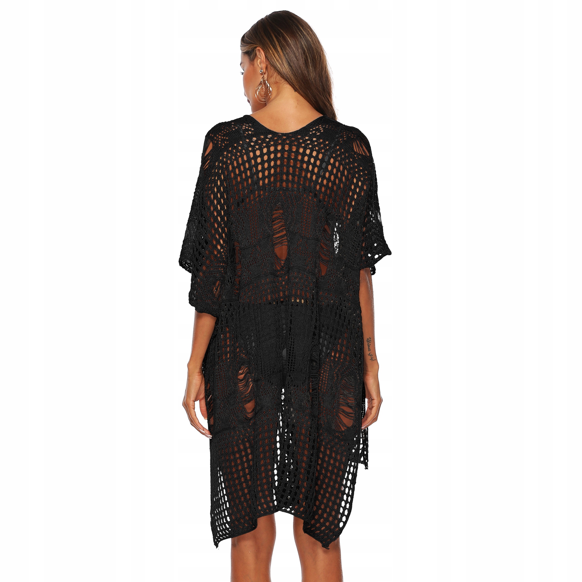 Ефектне ажурне пляжне плаття з приємного на дотик матеріалу. На горловині є шнурок. Завдяки вільному та зручному крою він ідеально підійде для будь-якого пляжного стилю.