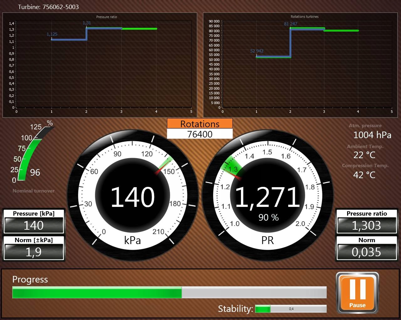 Пристрій для перевірки та регулювання систем із змінною геометрією та для вимірювання ефективності турбокомпресорів. Машина має можливість налаштування пневматичних та електронних приводів відповідно до специфікацій виробника. З точки зору належної роботи змінної геометрії та ефективності тиску турбокомпресор не відрізняється від заводського нового турбокомпресора.