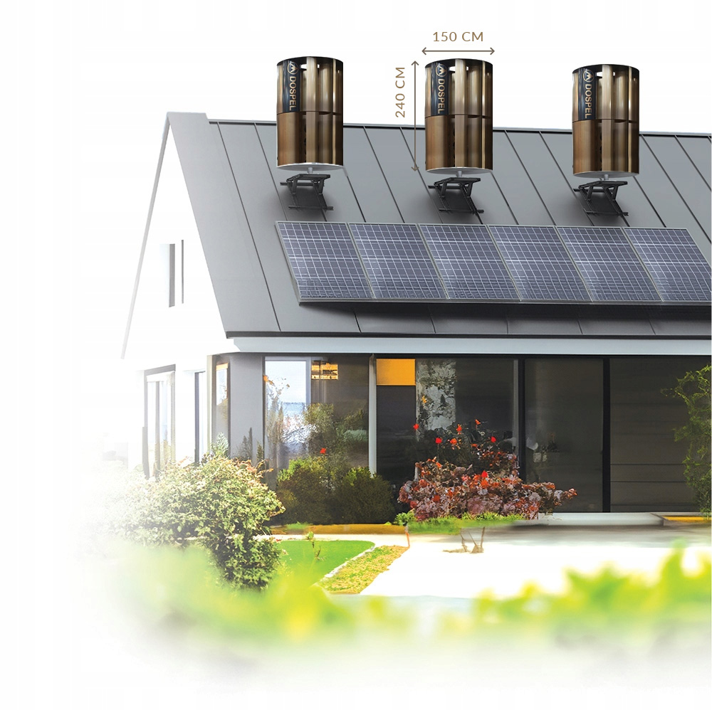 The Dospel Dragon 1500+ wind turbine generates electricity both during the day and at night, in summer and winter, for over 320 days a year! Тому це ідеальне доповнення до фотоелектричної системи. Ефективність фотоелектричних панелей у Польщі становить 15-20%. Завдяки гібридній установці з використанням вертикальних вітрових турбін Dospel Dragon ефективність виробництва електроенергії підвищується до 60%.