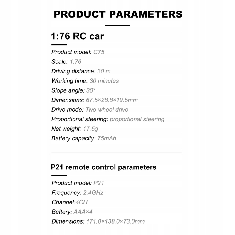 1:76 Car size RC: 67.5*28.8*19.5mm
