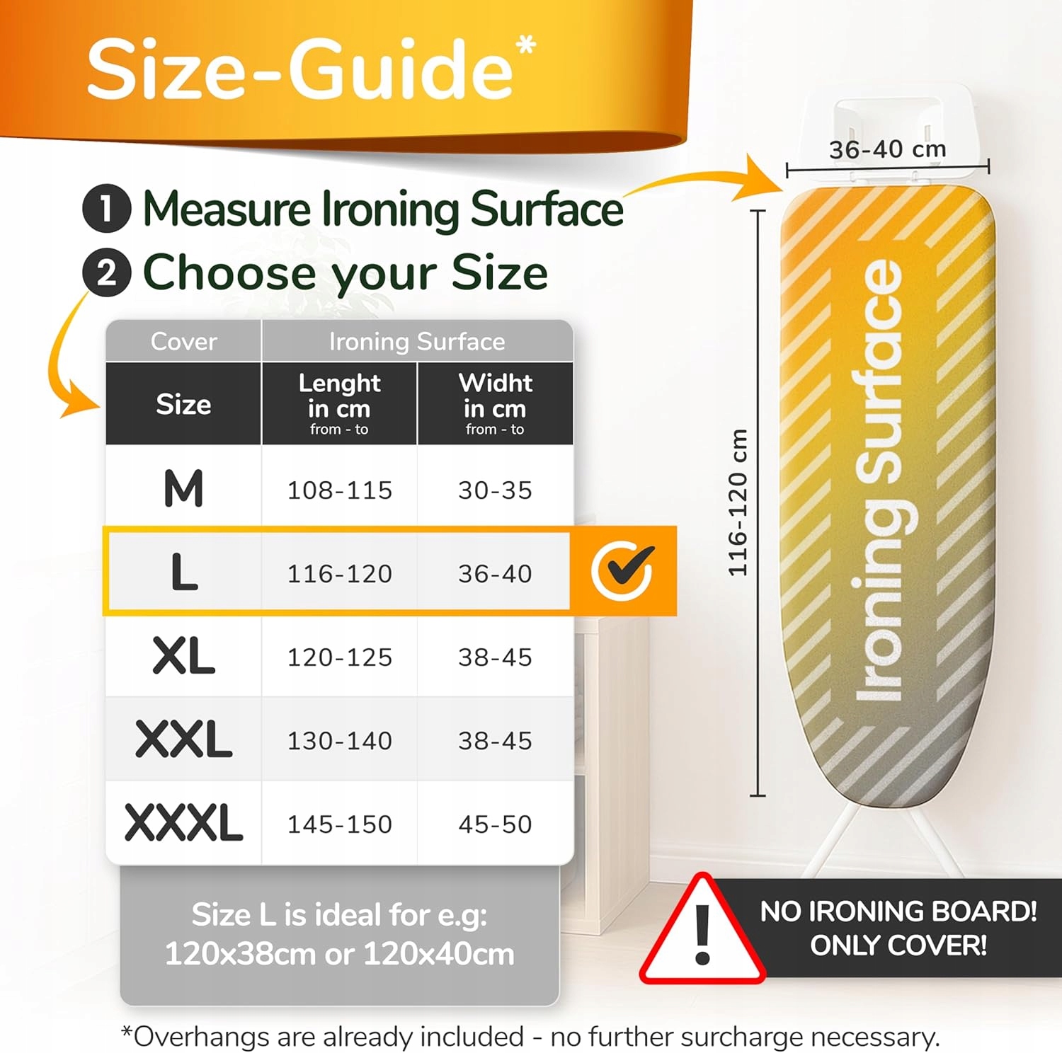 - Універсальна посадка: завдяки п'яти розмірам. L підходить для прасувальних дощок шириною 116-120 см і 36-40 см. Ідеально підходить для прасування столів, напр. 120 х 40 або 120 х 38 см. Розмір чохла: 128х50 см.