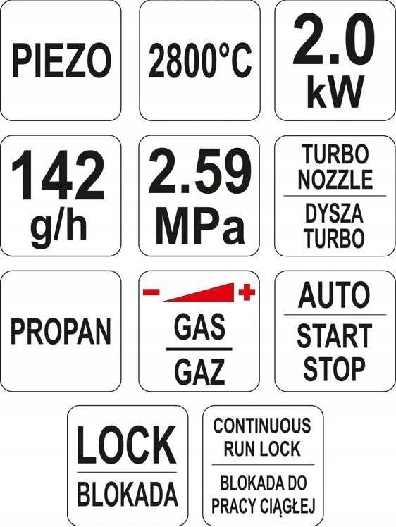 Завдяки використанню компонентів найвищої якості , наприклад корпус з латуні, пальник дозволяє досягти температури 2800°C і потужності 2,0 кВт. Він працює на газі пропан, що дозволяє досягти дуже високих робочих параметрів без необхідності підключення додаткових газових балонів.