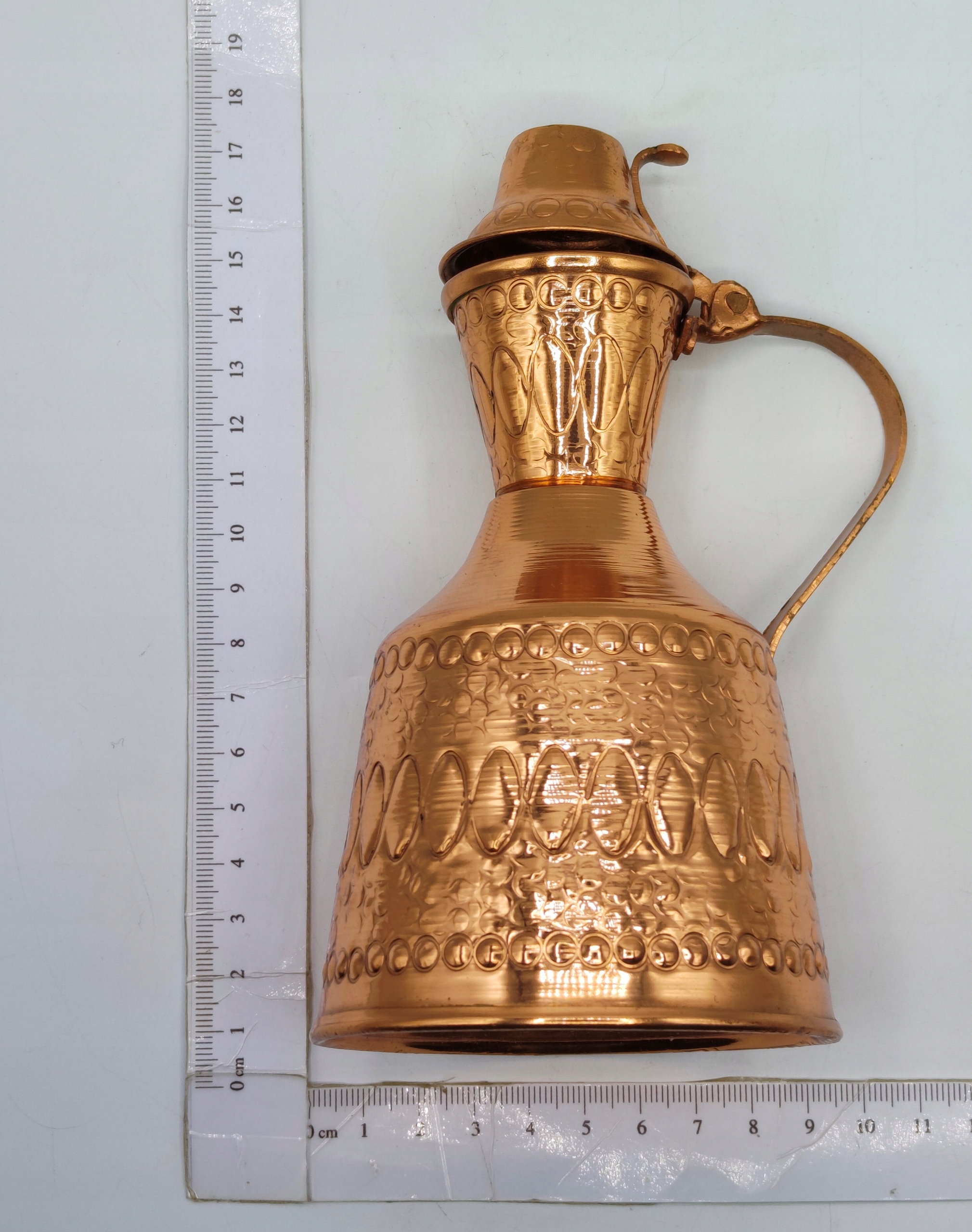 Ручна робота з міді. Висота 15,5 см, ширина, виміряна з ручками 10 см, діаметр зверху 10,5 см, діаметр низу 8,7 см, вага 160 грам. Предмет привезений з Туреччини як сувенір/прикраса, є колекційним і не витримує жодної критики. Це дуже гарна річ.