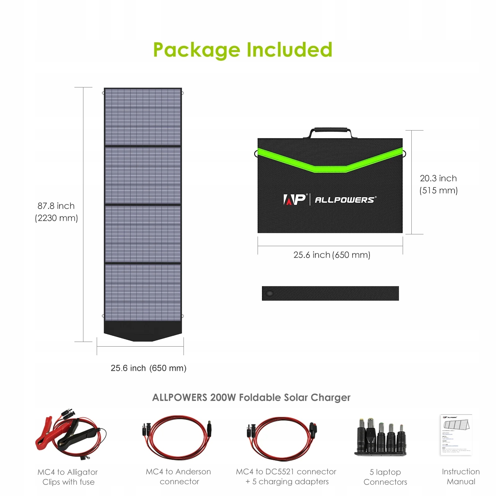Allpowers AP-SP-029-BLA забезпечує доступ до MC-4 (25 A макс.), DC (10 A) і подвійних портів USB (5 В/2,4 кожен). Завдяки цьому ви можете заряджати невеликі електронні пристрої, ноутбуки, автомобільні акумулятори (12 В) або портативні генератори. Порт розподільної коробки дозволяє підключати багато панелей паралельно.