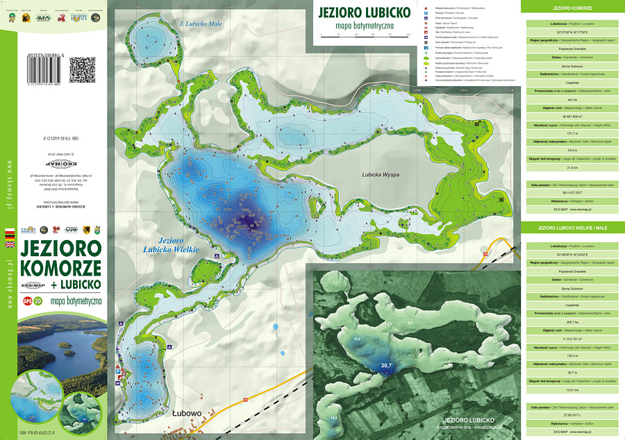 < б> Картографічна частина: Батиметричні карти озер Любицьке та Коморже; тривимірна візуалізація рельєфу дна; легенда польською, німецькою та англійською мовами.