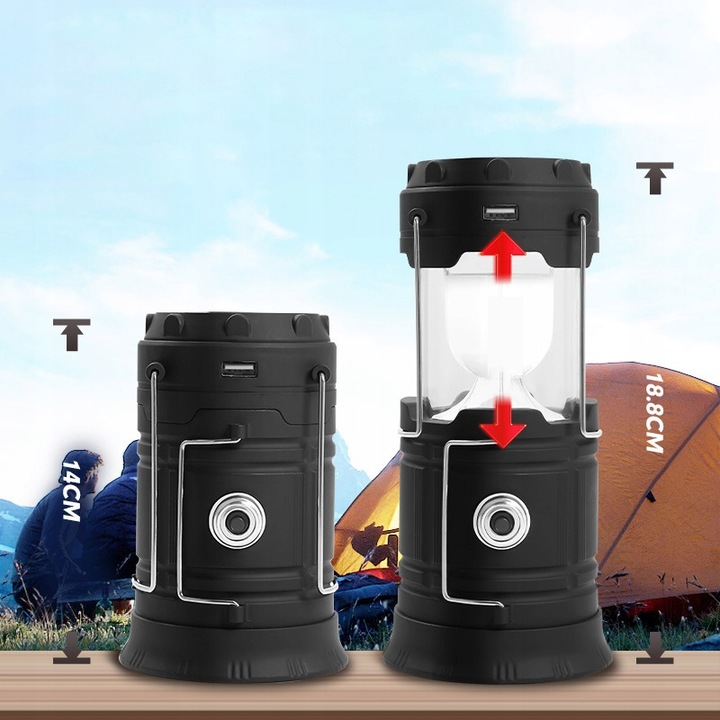 Багатофункціональний туристичний ліхтар із функцією ліхтарика, USB-входом і вбудованою сонячною панеллю b> . Практична водостійка та ударостійка світлодіодна лампа, ідеально підходить для дачі, кемпінгу або як альтернативне джерело світла у разі відключення електроенергії.