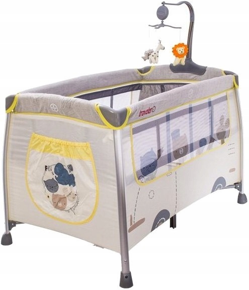 Вага дитини до 15 кг, дуже міцна, легка конструкція, два колеса для переміщення ліжка, матрац, москітна сітка, дорожня сумка для ліжка, зручна та легка система розкладання. Роз'ємний мобіль з трьома іграшками та музичною скринькою. Музична шкатулка ручного заводу в каруселі. Бічна кишеня. Додатковий бічний вхід застібається на блискавку. Пеленальний столик має кишеню, ремінь безпеки та ручки, які кріплять його до боків ліжка, щоб уникнути ковзання. Розібраний пеленальний столик можна прикріпити до бортика ліжка за допомогою спеціальних ручок.